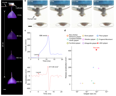 实验显示,对于直径70微米、重0.05毫克的人类发丝,LiMU抓手可在6毫秒内将其加速至696毫米/秒(约8700倍体长/秒),峰值加速度达42G。这一指标不仅远超现有机器人抓手,也位列自然界生物与人工致动器中的最快释放速度之一。