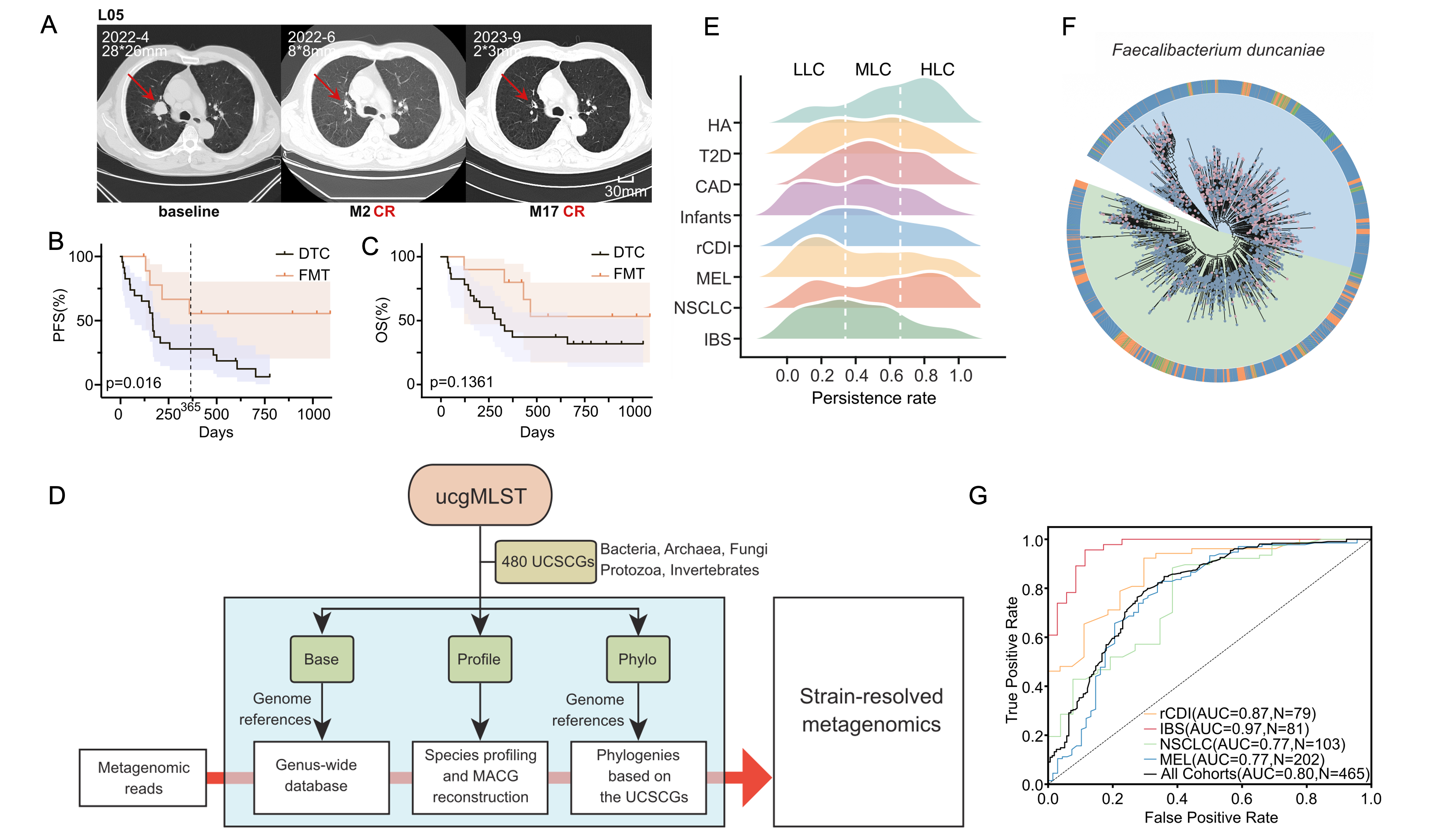 研究团队首先针对晚期PD-L1阴性非小细胞肺癌免疫治疗敏感度低这一临床难点,开展了前瞻性临床试验,结果显示FMT联合抗PD-1治疗将患者的一年无进展生存期(PFS)从传统治疗的28%提升至55%。为了破解疗效背后的微生态密码,团队开发了基于480个超保守单拷贝基因的高分辨率菌株追踪框架ucgMLST。通过对肺癌、黑色素瘤、肠易激综合征及艰难梭菌感染等涵盖2000余份样本的8个跨疾病队列分析,研究发现传统物种水平的丰度分析难以解释疗效差异,更多功能差异隐藏在菌株水平的遗传异质性中。例如,Faecalibacterium duncaniae等物种在不同进化分支上展现出截然相反的临床效应,健康相关菌株富含增强肠道屏障的功能基因,而疾病相关菌株则富集应激适应相关基因。