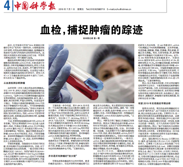2014年2月19日,一篇被选为选为美国科学杂志子刊《科学转化医学》封面故事的研究称,肿瘤脱落在血液中的某些DNA片段有潜力用于早期癌症非侵入性筛查,监测治疗效果,以及帮助解释某些癌症抵抗治疗的原因。同时,这些来自约翰霍普金斯大学Kimmel癌症中心的研究人员还发现,在640例患者中,ctDNA可检测超过75%的晚期胰腺癌,卵巢癌、结直肠癌、膀胱癌、胃癌、乳腺癌、黑色素瘤、肝癌,以及头颈癌。然而,在原发性脑、肾、前列腺癌和甲状腺癌的可检测率却不到50%。此外,在206例转移性结直肠癌患者中,对源自KRAS基因突变的ctDNA检出率达87.2%、检测特异性达99.2%。而对髓母细胞瘤、转移性肾癌、前列腺癌或甲状腺癌患者血液中肿瘤ctDNA的检出率不到50%,对脑胶质瘤患者的检出率更低,不到10%。“这些研究结果表明不同类型癌症血液检测结果可靠性不同,特别是脑瘤的检出率很低,可能原因在于血脑屏障的存在阻碍了脑胶质瘤细胞及其DNA进入外周血液。”王建荣解释说。