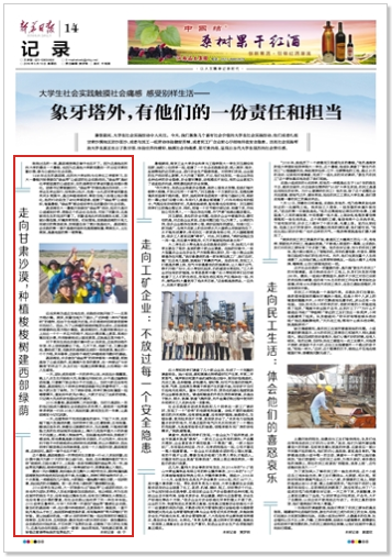 暑假期间,大学生社会实践活动令人关注。今天,我们聚焦几个富有社会价值的大学生社会实践活动,他们或者扎根甘肃沙漠地区防沙固沙,或者与民工一起劳动体验酸甜苦辣,或者到工厂企业耐心仔细地排查安全隐患。这些社会实践帮助大学生真正走出了象牙塔,体验世界的精彩,触摸社会的痛感,更可贵的是,呈现出当代大学生强烈的社会责任感。