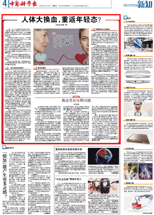 近日,我校唐仲英血液学研究中心王建荣教授就换血能否长寿议题接受《中国科学报》专访。