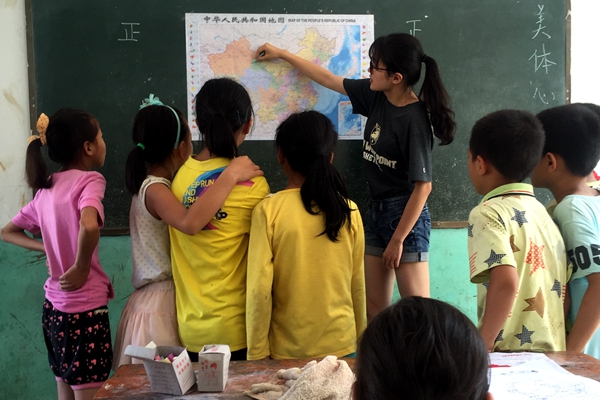 “这里是广东省,我爸爸在这里打工”“江苏有很多大学……如果努力学习,老师相信你一定可以去。”支教队员陈玟妤上地理课,她用游戏方式让孩子们了解中国,鼓励孩子们走出大山。