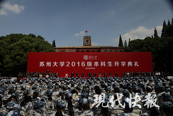 昨天上午,在苏州大学本部钟楼草坪,隆重举办2016级本科生开学典礼,校长熊思东致辞,寄语来自13个国家和全国各地的6500余名本科新生,要在大学阶段勇于发现自我、完善自我和超越自我。最后,熊思东还为16名当天过生日的新生送上了生日祝福。