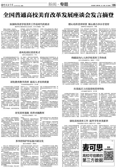 未来美育改革发展举措。一是抓好美育的教学课堂。整合校内外优势资源,完善美育课程模块,将美育课程打造成全方位、立体多维的课程体系。二是抓好美育的实践课堂。重点做好传统文化和地方文化特色课程实践课堂,组建相关社团进行重点指导。三是抓好美育的社会课堂。我校和苏州市教育局牵头筹建苏州美育协同创新中心,搭建共享平台,共同推进美育工作。四是抓好美育的网络课堂。积极探索“互联网+”美育新模式,推动信息技术与学校美育深度融合。