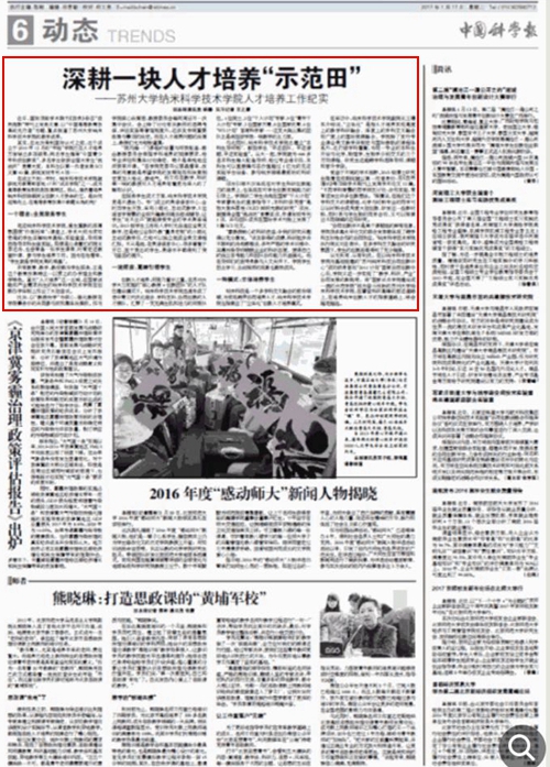近日,国际顶级学术期刊《自然》杂志“自然指数”特刊上发表文章,以“中国高等教育改革的先行者”为题,重点报道了苏州大学纳米科学技术学院的教学成果。