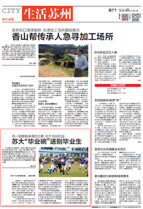 毕业季的大学校园,充满了离别的淡淡感伤与太多的依恋不舍,苏州大学选择了举办一场酣畅淋漓的美式橄榄球赛送别毕业生,给校园带来了更多的欢乐气氛。6月18日下午,一场名为“毕业碗”的美式橄榄球表演赛在苏州大学东区田径场举行,这也是该校首次举办校园美式橄榄球赛,数百名毕业生们受邀观看了整场比赛。