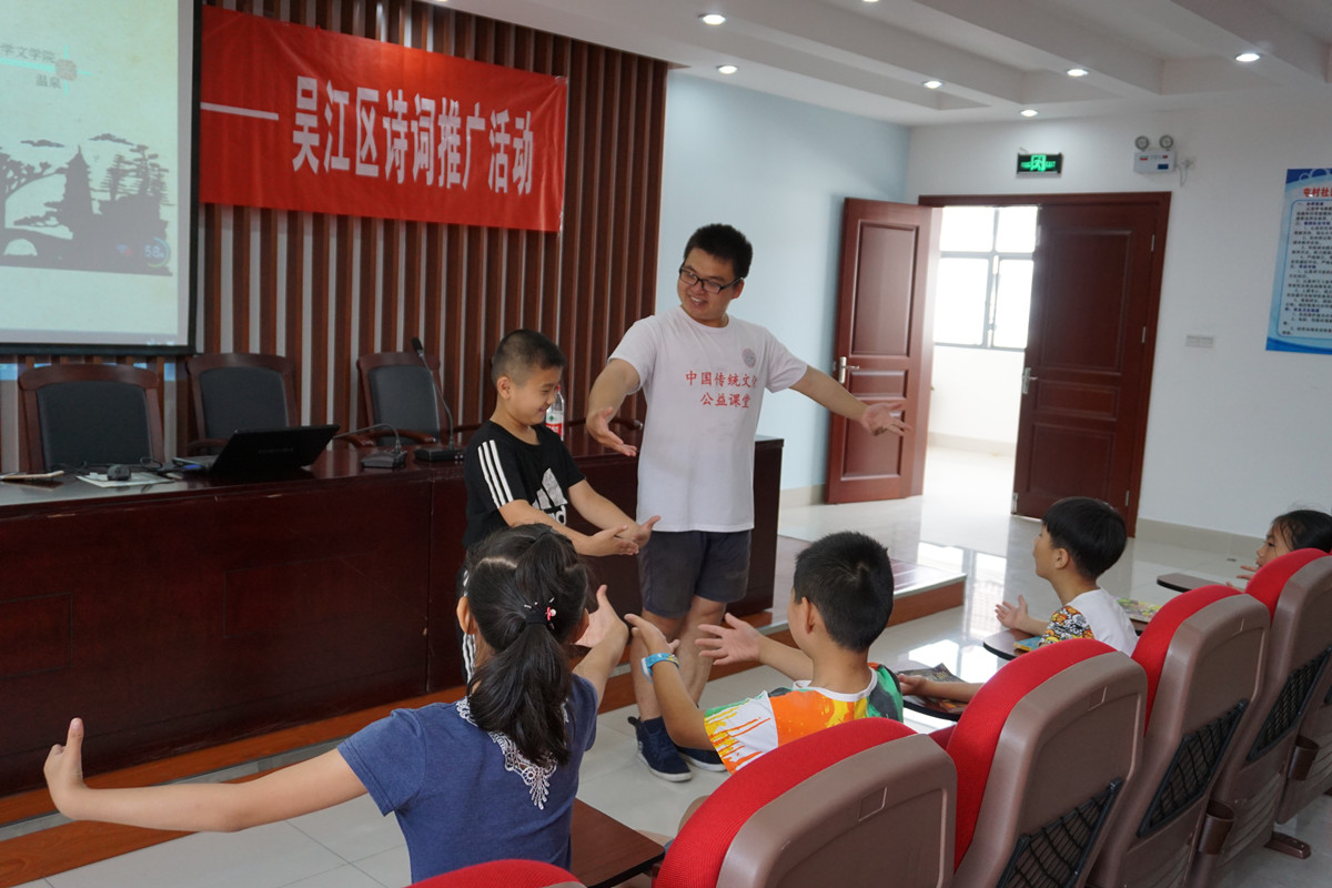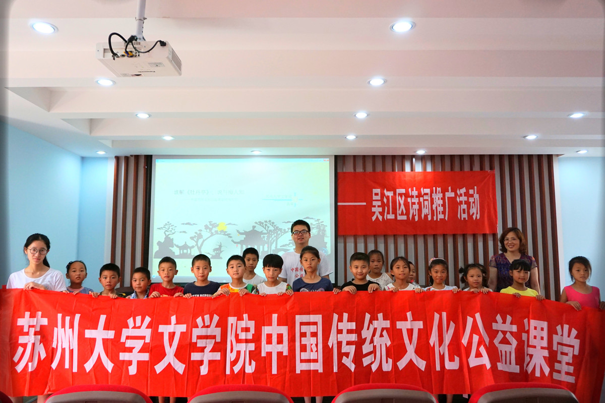 据悉,为了促进以古典诗词为代表的中国传统文化的传承与弘扬,苏州市吴江区宣传部、吴江区团委、苏州大学文学院团委于今年5月共同启动了中国传统文化公益课堂项目。此项目以苏州大学文学院深厚的人文积淀为推力,以遵循学生认知规律与教育教学规律的教学活动为载体,选取唐诗、宋词、元曲等古典诗词作为切入点,融入文化教育、艺术教育、思想教育等多个方面的内容,直至目前完成了所有课程。在此期间,苏州大学文学院的志愿者们在苏州市多所学校和社区开展了共10场活动,吸引了500余名小学生的参与。