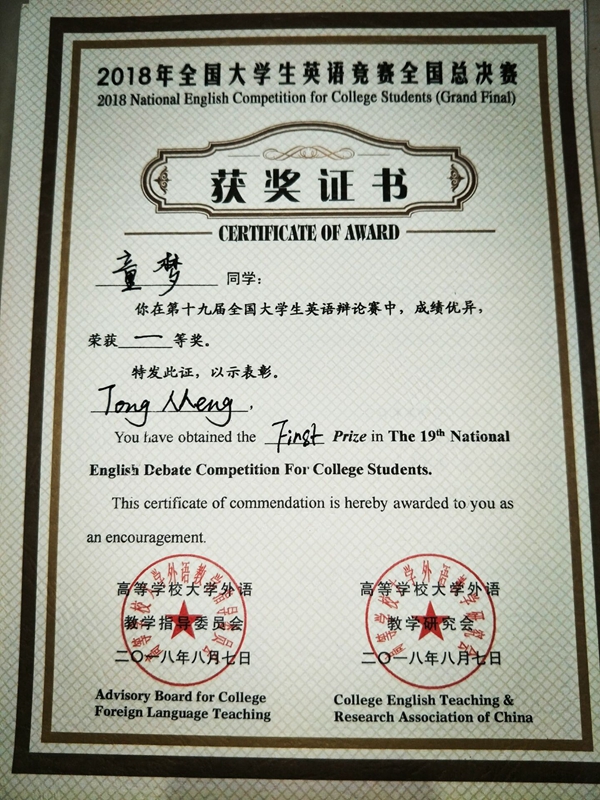 全国大学生英语大赛是由教育部高等学校大学外语教学指导委员会和高等学校大学外语教学研究会联合主办的全国唯一的大学生英语综合能力竞赛。童梦是连续三年参加此项赛事,每一年都取得骄人成绩,今年获得的奖项为历年之最。