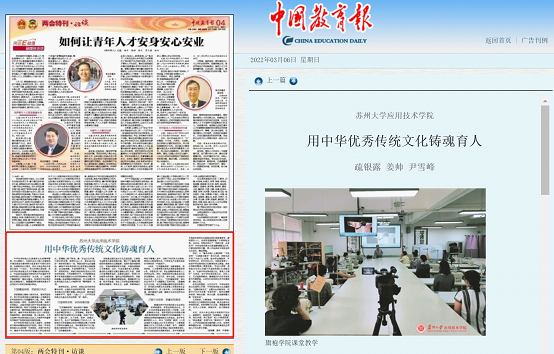 3月6日,《中国教育报》在两会特刊,以《苏州大学应用技术学院——用中华优秀传统文化铸魂育人》为题,报道了应用技术学院充分发挥产教融合优势,在传统文化育人矩阵建设上所取得的成就。作为国家级权威媒体,《中国教育报》在两会特刊上刊发相关新闻,对学院进一步行稳致远地“走出去”具有重大意义。