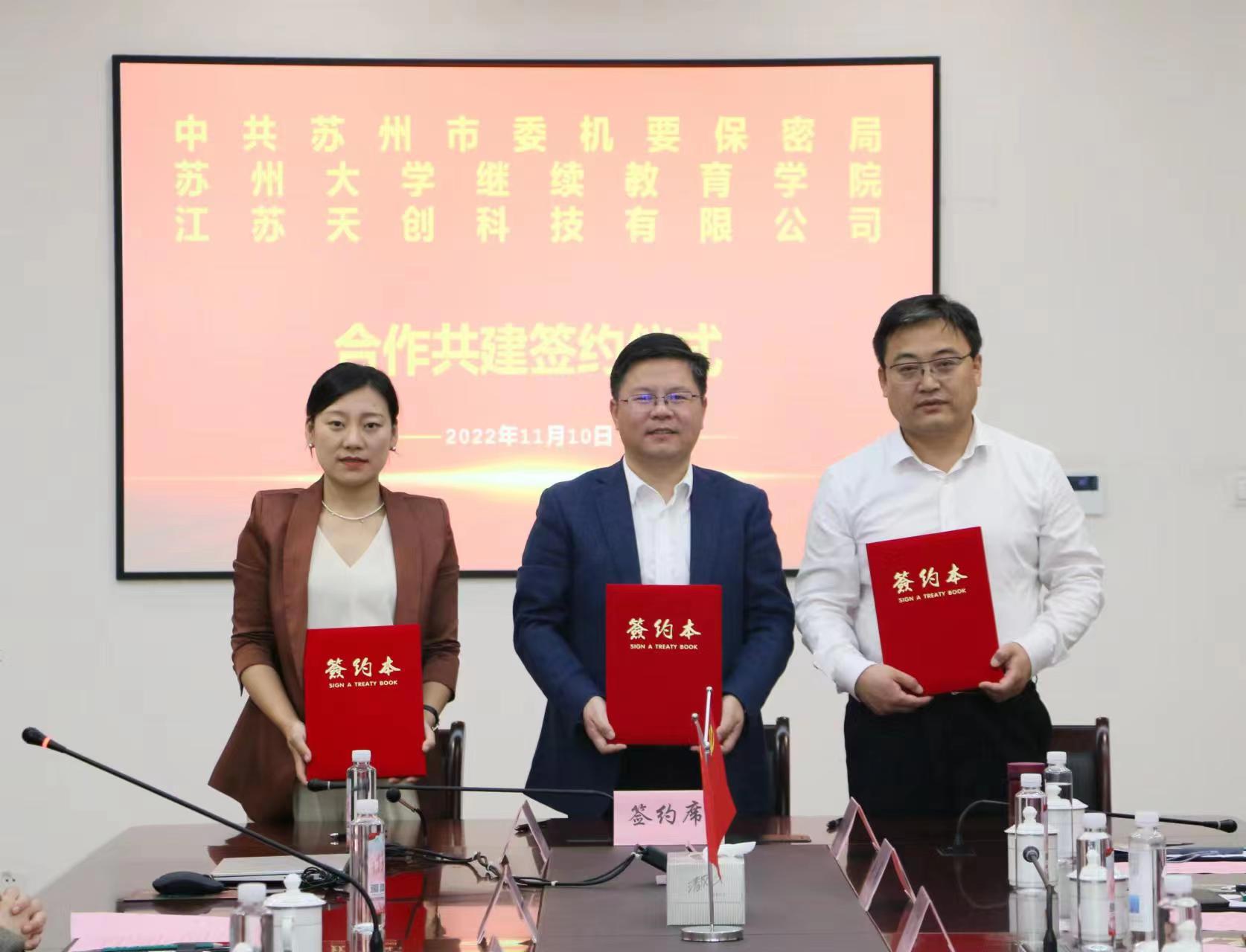 11月10日下午,苏州市委机要保密局、苏州大学继续教育学院、江苏天创科技有限公司在苏州市保密技术管理服务中心签署合作共建协议,苏州市保密技术管理服务中心将成为苏州大学继续教育学院保密实训教育基地。苏州大学将以此次三方共建为重要契机,致力于打造集国家安全宣传、警示教育、安全保密教育培训、场景演示于一体的保密教育实训基地,增强党政管理人员、涉密人员安全保密意识,提升相关专业技术人员安全保密技术和技能。
