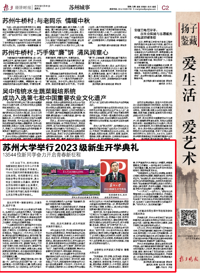 9月24日下午,苏州大学在独墅湖校区恩玲艺术中心户外草坪举行2023级新生开学典礼,13544位新同学的青春新征程从这里启程。校党委副书记、校长张晓宏等全体在校校领导,澳大利亚工程院院士吴鑫华,俄罗斯自然科学院外籍院士长海博文,江苏省苏州中学副校长曹文杰,江苏省无锡市辅仁高级中学副校长吴宝平等出席开学典礼。