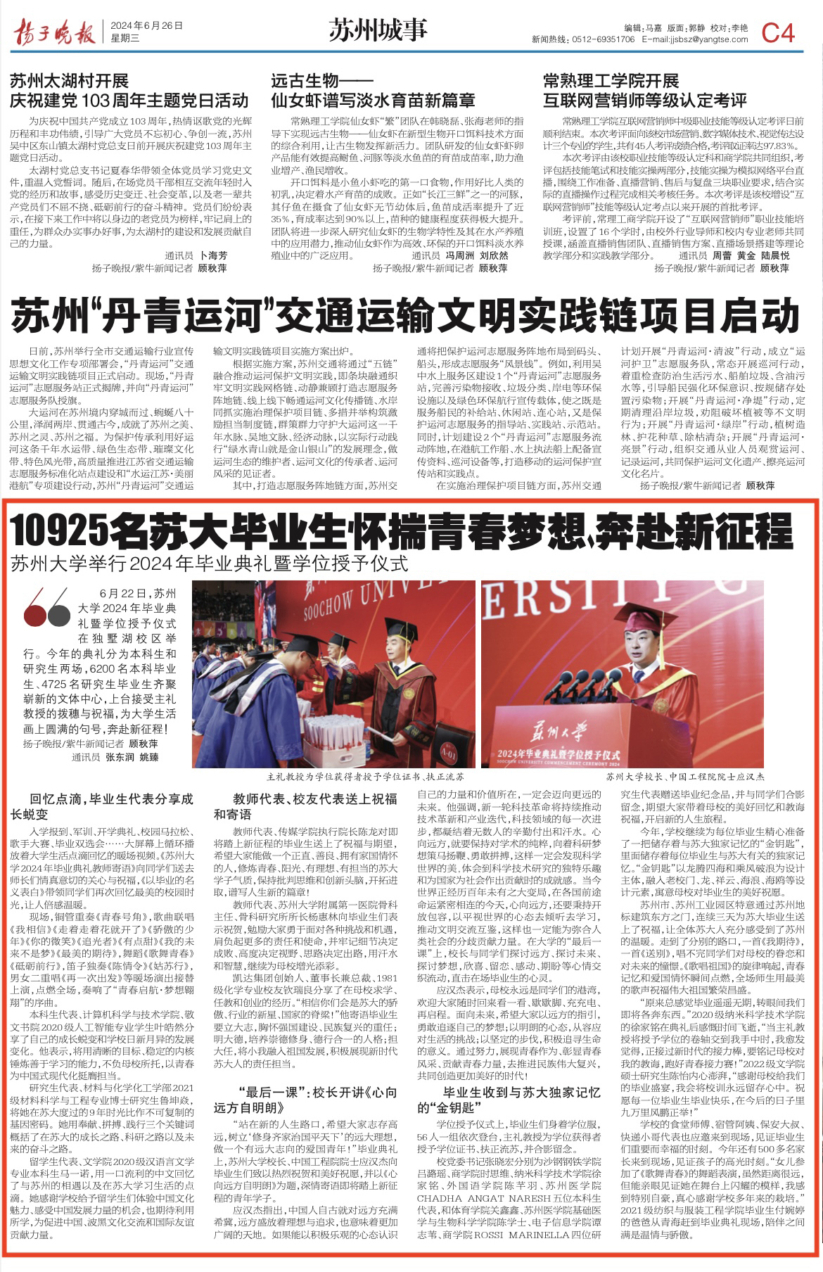 研究生代表、材料与化学化工学部2021级材料科学与工程专业博士研究生鲁坤焱,将她在苏大度过的9年时光比作不可复制的基因密码。她用奉献、拼搏、践行三个关键词概括了在苏大的成长之路、科研之路以及未来的奋斗之路。