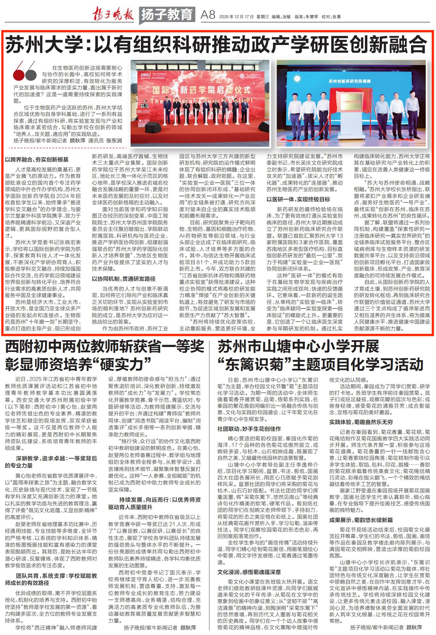 目前,研究院聚焦分子靶向药物、生物药、基因和细胞治疗药物、AI药物研发等前沿领域,与行业头部企业达成了在临床前研究、临床试验、人才培养等多方面的合作。其中,与信达生物开展临床试验项目81个,并成功助力5款创新药上市。今年,双方联合共建的“江苏省创新抗体药物和偶联药物重点实验室”获得批准建设。这种校企协同的模式将高校的研发能力精准“焊接”在产业创新的关键轨道上,有效避免了研发与市场的脱节,为促进区域创新发展和发展新质生产力贡献了“苏大智慧”。
