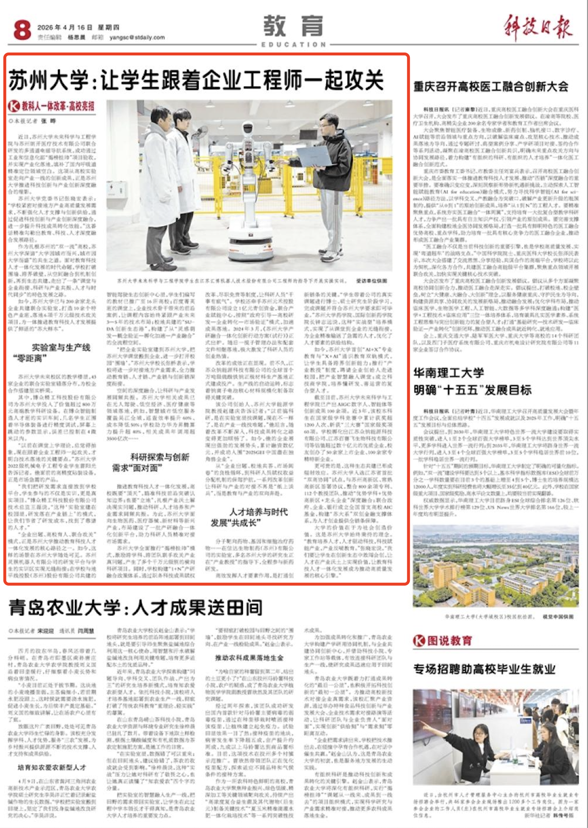 如今,苏州大学已与200余家龙头企业共建联合实验室,打造10余个特色产业班,落地6项千万元级技术攻关项目,为一体推进教育科技人才发展提供了鲜活的“苏大样本”。