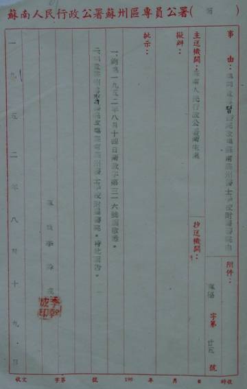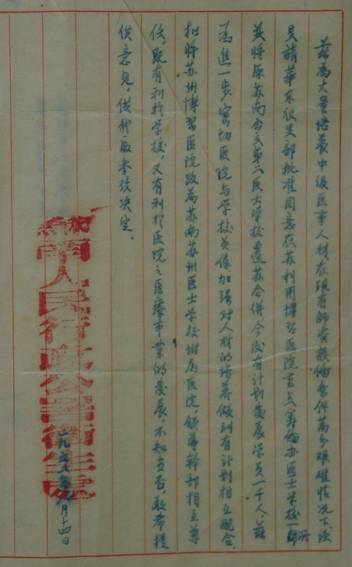 1952年8月19日,苏南人民行政公署苏州区专员公署专员李干成签署并回复:“一、钧处1952年8月14日卫教字316号函敬悉。二、同意苏州博习医院改为苏南苏州医士学校附属医院。特此函告。”(图1、2)