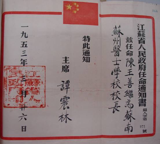 1952年11月,苏南行政区、苏北行政区、南京市合并建立江苏省。1953年1月正式建省后,1953年3月,苏南公立苏州医士学校属江苏省人民政府卫生厅直接领导,江苏省人民政府任命陈王善继为校长,陈邦贤、郑振汉为副校长(之后,历任的校领导还有丁国栋、羊超等);1954年2月,改属苏州市人民政府领导,更名为江苏省苏州医士学校, 1954年8月,常熟医士学校并入苏州医士学校(图3)。