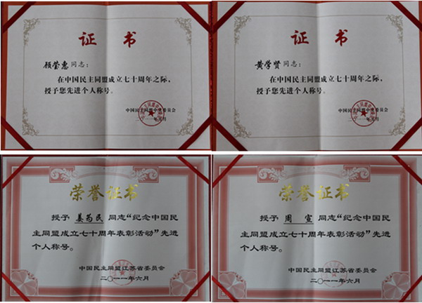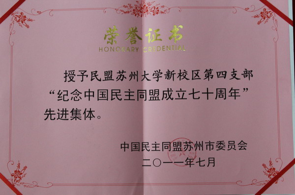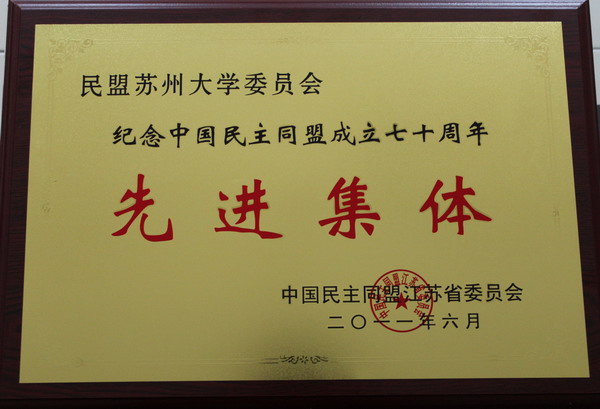 2011年度,为纪念中国民主同盟成立七十周年,民盟中央、民盟江苏省委、民盟苏州市委表彰了一批先进集体和个人。我校顾莹惠、黄学贤同志被民盟中央授予先进个人荣誉称号;民盟苏大委员会被民盟江苏省委评为先进集体,姜为民、周宣同志被评为先进个人;民盟苏州大学新校区第四支部被民盟苏州市委评为先进集体,唐天驷、戈志强、王文利、朱桂荣、王莉、计云倩等同志被评为先进个人。
