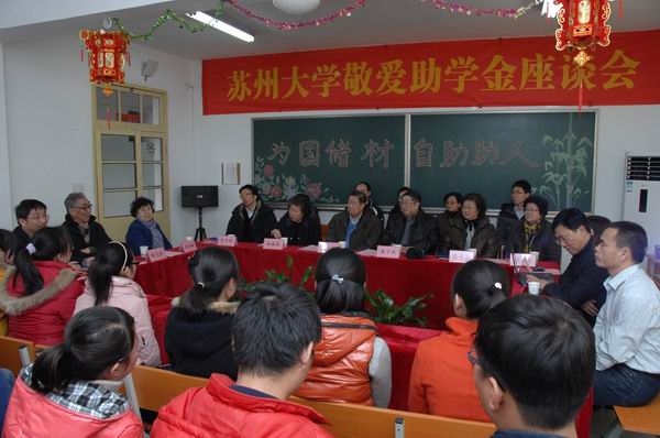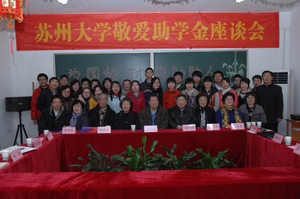 下午,2011—2012苏州大学敬爱助学金座谈会在敬文书院北楼302室召开。朱敬文教育基金会部分成员及家人,朱敬文教育基金会大陆代表陈克潜及夫人陆忠娥,校党委副书记、副校长江涌,学生工作部(处)、敬文书院相关领导、老师,敬爱助学金受助学生代表、敬文书院学生代表出席了本次座谈会。学生工作部(处)处长张国华主持会议。