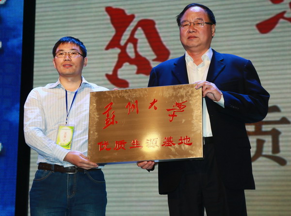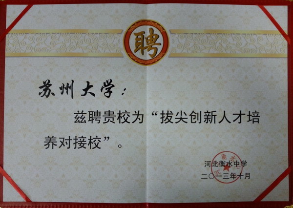 参加活动期间,我校教师重点介绍苏大的发展历程、专业设置、师资力量、科研成果、招生计划等情况,并与现场学生进行面对面交流,回答学生关心的招生政策、就业情况、大学生活等问题,让师生们对苏州大学和苏州这座城市有了更加全面而较深的了解。同时还举行了我校优质生源基地的授牌仪式。河北衡水中学校长感谢我校将河北衡水中学列为优质生源基地,并希望双方进一步加强合作、增强沟通,并聘任我校为河北衡水中学的“拔尖创新人才培养对接校”。