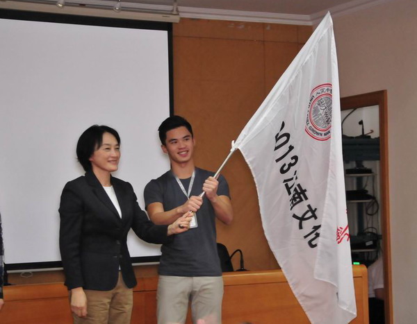 在全体同学热烈的掌声中,东吴大学学生代表黄为旸同学从蒋星红副校长手中接过了“江南文化研习营”的营旗,宣告活动的正式开始。