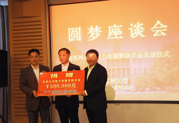 座谈会正式开始前,徐之伟代表江苏隆力奇生物科技股份有限公司向江苏省关心下一代基金会苏州分会捐赠圆梦基金50万元,随后,戴亚东向我校发放圆梦助学金。