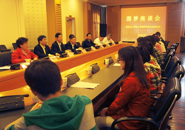 5月7日下午,圆梦座谈会暨隆力奇圆梦助学金发放仪式在红楼217会议室举行。原苏州市委书记、江苏省关工委常务副主任、苏州关工委名誉主任王敏生,苏州市委副秘书长、市委办公室主任申爱军,苏州市关工委主任谢慧新,苏州市关工委常务副主任秦兴元,原苏州市工商局局长、江苏省关心下一代基金会副理事长、苏州分会会长戴亚东,苏州市关工委办公室主任金正蒙,江苏省关心下一代基金会苏州分会秘书长汤伟民,江苏隆力奇生物科技股份有限公司董事长徐之伟,我校党委副书记、副校长江涌,学生工作部(处)处长张国华,发展委员会办公室主任赵阳,学生工作部(处)副处长陈平以及我校部分受资助同学参加了座谈会。