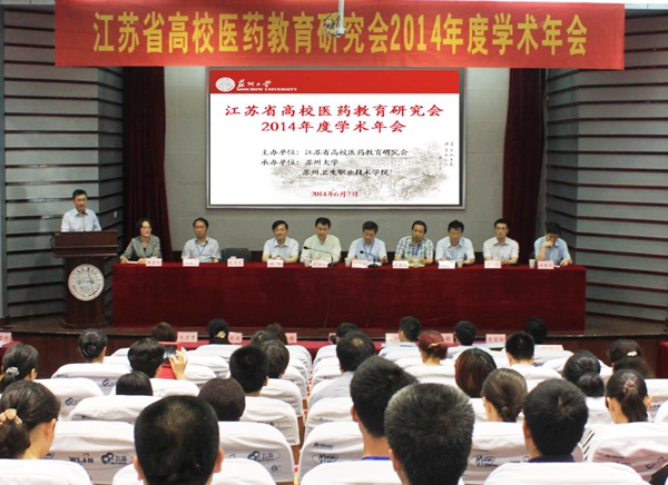 6月7日,由苏州大学和苏州卫生职业技术学院共同承办的江苏省高校医药教育研究会2014年度学术年会在我校红楼学术报告厅召开。江苏省教育厅高教处处长袁靖宇出席会议并讲话,高教出版社副总编辑林金安和北京大学教育学院尚俊杰教授受邀到会讲座,全省16家医药教育研究会理事单位代表等近百人出席了会议。会议开幕式由副校长蒋星红主持。