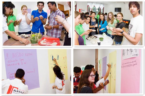 在随后的中华传统美食体验活动中,留学生管理科的老师准备了苏式点心、水果、饮料等食物。为了让留学生体验包饺子的乐趣,老师们购买了不同种类的馅和面皮,将学生分为三组,分别由一位老师示范、指导包饺子的方法。这些来自异国他乡的学生只在餐馆里吃过,却从来没有亲手包过。经过一番学习,留学生们有模有样地开始操作。大家相互鼓励、合作,欢声、笑语汇成一片,忙得不亦乐乎。包饺子看似简单,实则大有学问。澳大利亚学生小和说:“把饺子包在软软的面皮里,还要捏严,太不容易了。”通过不断的尝试,同学们最终掌握了包饺子的方法,捏出了一个个饱满、圆实的饺子。吃到了自己包的饺子,小和开心地和同学一起合影留念。吃完饺子,大家来到了留言墙前,把自己最想表达的语言写在了上面,玛依拉木用吉尔吉斯语和汉语写到:“孔子学院十周年快乐。”同学们把真诚的祝福和心愿写在了留言墙上。几个对剪纸感兴趣的女生还在老师的指导下学起了剪纸。