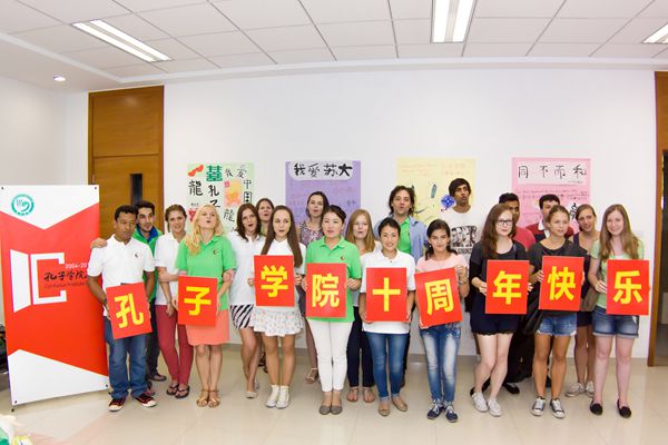 最后,所有的留学生与老师们一起在精心制作的留言墙前合影留念,共同表达了对孔子学院成立十周年的祝福。