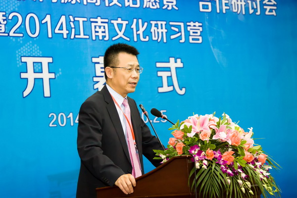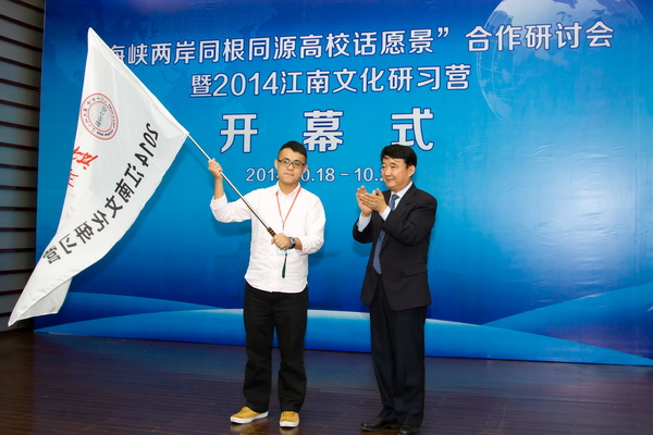 在全体师生热烈的掌声中,台湾大学学生代表林德强同学从王卓君书记手中接过了“2014江南文化研习营”的营旗,宣告研习营活动的正式开始。