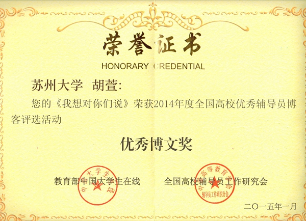 全国高校优秀辅导员博客评选活动由中国大学生在线、全国高校辅导员工作研究会主办,旨在深入贯彻党的十八大精神和十八届三中、四中全会精神,进一步提高辅导员利用网络开展思想政治工作的能力和水平,增强大学生思想政治工作的针对性和实效性。该比赛分为博文、博客评选两部分,通过用户在线评选,专家在线评审,省级教育部门推荐,共评出“优秀博文奖”100篇,优秀博客奖、组织奖若干。