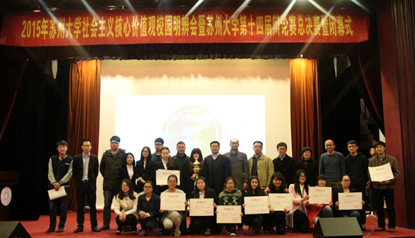 4月10日晚,2015年苏州大学社会主义核心价值观校园明辨会暨第十四届辩论赛决赛在本部敬贤堂隆重举行。校党委副书记、副校长江作军,校团委书记肖甫青,政治与公共管理学院党委副书记、副院长邢光晟和电子信息学院党委副书记、副院长袁冬梅等出席活动。西交利物浦大学、苏州市职业大学和苏州一中的老师同学们观摩了本次比赛。庄友刚、吴铁钧、陈国坤、穆杨、钱海老师担任本次大赛的评委。