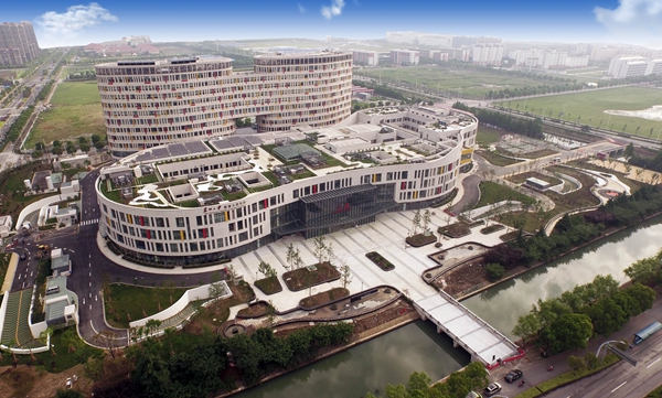 苏州大学附属儿童医院(总院)位于苏州工业园区钟南街92号,占地面积5.9万平方米,总建筑面积13.3万平方米,病房楼12层,主体裙房4层,一期工程总投资8.48亿元。总院按日门诊量3000人次、日急诊300人次设计,床位设置600张。总院的建筑面积比景德路院区足足大了三倍,门诊接待量以及床位数量也都扩大了一倍。在建筑设计上,附属儿童医院(总院)采用了“细胞分裂式”的设计构造,十分符合儿童的“审美观”,展现了儿童的生命活力。门诊大楼外观像个扁平的细胞,住院部形似双子楼,中间相连,外观也是扁椭圆状。医院内部构造更处处体现绿色建筑的低碳环保人文理念,并结合了儿童医院特色,展现儿童生命活力,尽可能减少孩子的就医恐惧感,为孩子提供良好的就医体验。