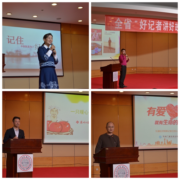 “老兵不曾死去,却在无声凋零,如果再不行动,就真的来不及了。”宿迁晚报采访部副主任顾园园带领团队花费四个月奔波三千多公里记录了70多位宿迁老兵的抗战故事的报道经历让我校学生热泪盈眶。此次来苏州大学演讲的记者们,有的经历重大灾难事件的报道,有的深入基层关注弱势群体的生活,有的把典型人物的故事传播给大众。江苏广播电视总台城市频道记者杨威以“记住不仅仅为了纪念”为主题的演讲分享了她第一时间参与东方之星沉船事件救援和北川地震救援的经历,江苏新闻广播新闻特报部记者朱亮为了骆马湖的生态环保曾冒着生命危险寻找非法采砂的证据,用新闻报道做好事,做实事。其中,苏州日报社《城市早8点》记者戈亮带来的“一只暖心的苹果”,苏州广电交通频率主持人方超为白血病患者捐献骨髓的经历、感悟和倡议,引起了在场观众的热烈反响……一线记者们用各自的工作经历讲述中国故事,展现了广大新闻工作者坚持马克思主义新闻观、自觉践行社会主义核心价值观,爱岗敬业、无私奉献的精神风貌。