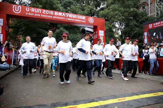 下午,U-run2016苏州大学校园马拉松活力赛正式拉开帷幕。我校校领导袁银男、陈一星、江作军、杨一心、蒋星红,江苏省教育厅体卫艺处处长张鲤鲤,江苏省体育局综合处副处长成裕阳,苏州市体育局局长周志芳,全国高校体育专业委员会副主席、江苏大学生体育学会主席王家宏,江苏省体协、省内友好高校体育院系主任,以及我校相关职能部门及学院(部)领导出席了起跑仪式。