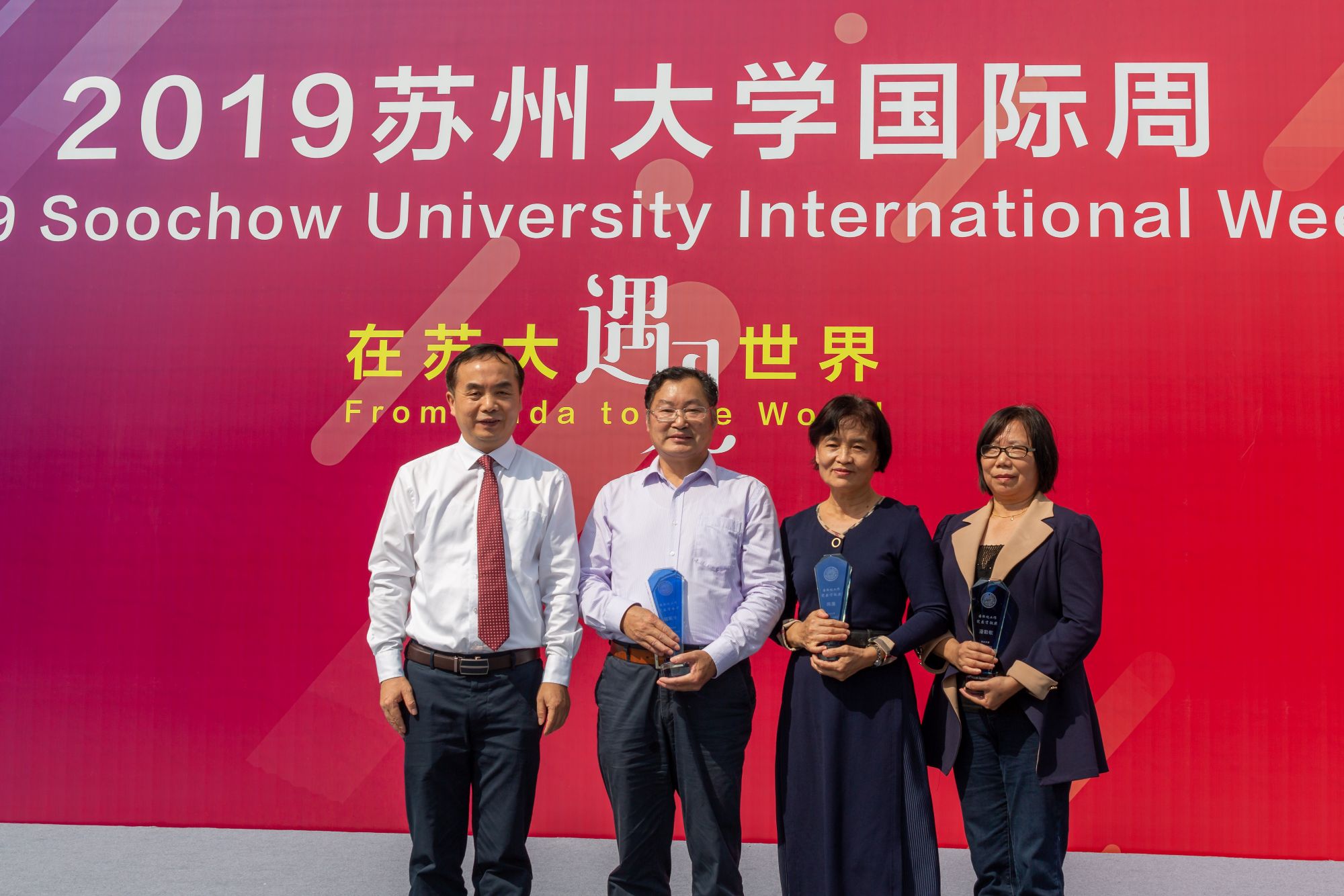 随后,现场举行了苏州大学国际化工作突出贡献奖颁奖仪式,以此对长期为我校国际合作与交流事业做出突出贡献、取得重大成果的老师予以表彰。纺织与服装工程学院的陈雁教授、政治与公共管理学院的钮菊生教授、材料与化工学部潘勤敏教授分获此奖项。张晓宏为获奖老师颁奖并合影留念。