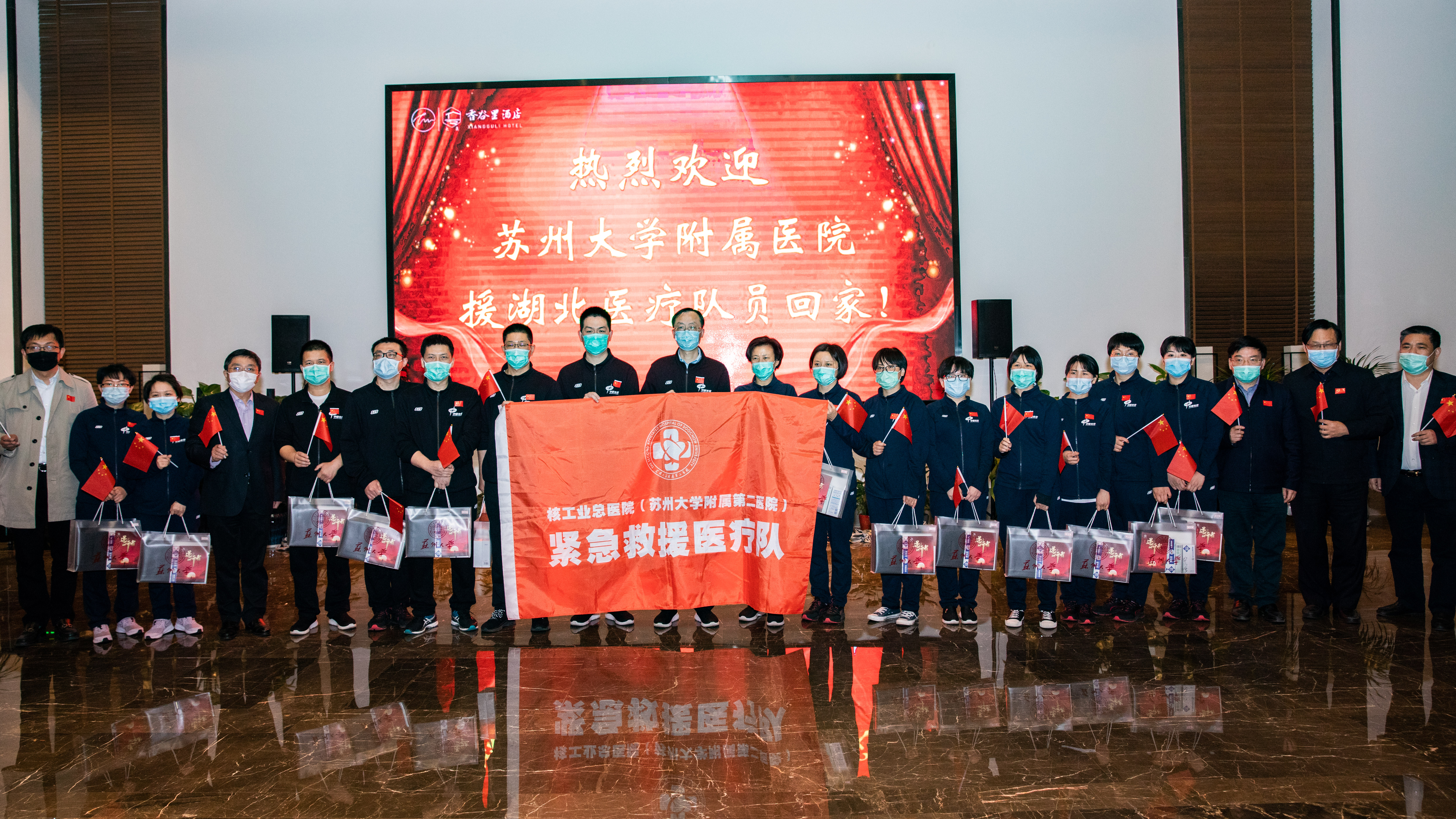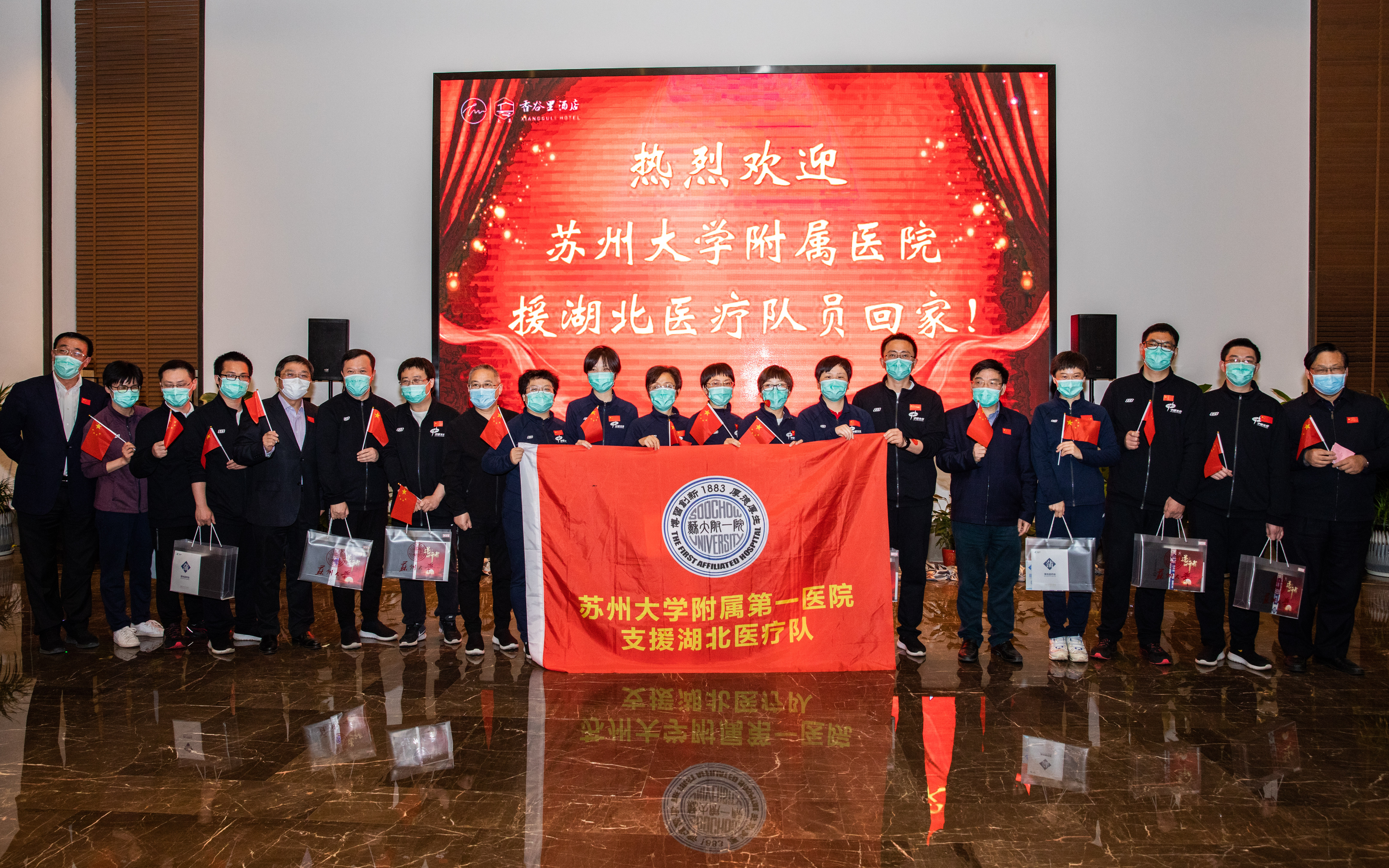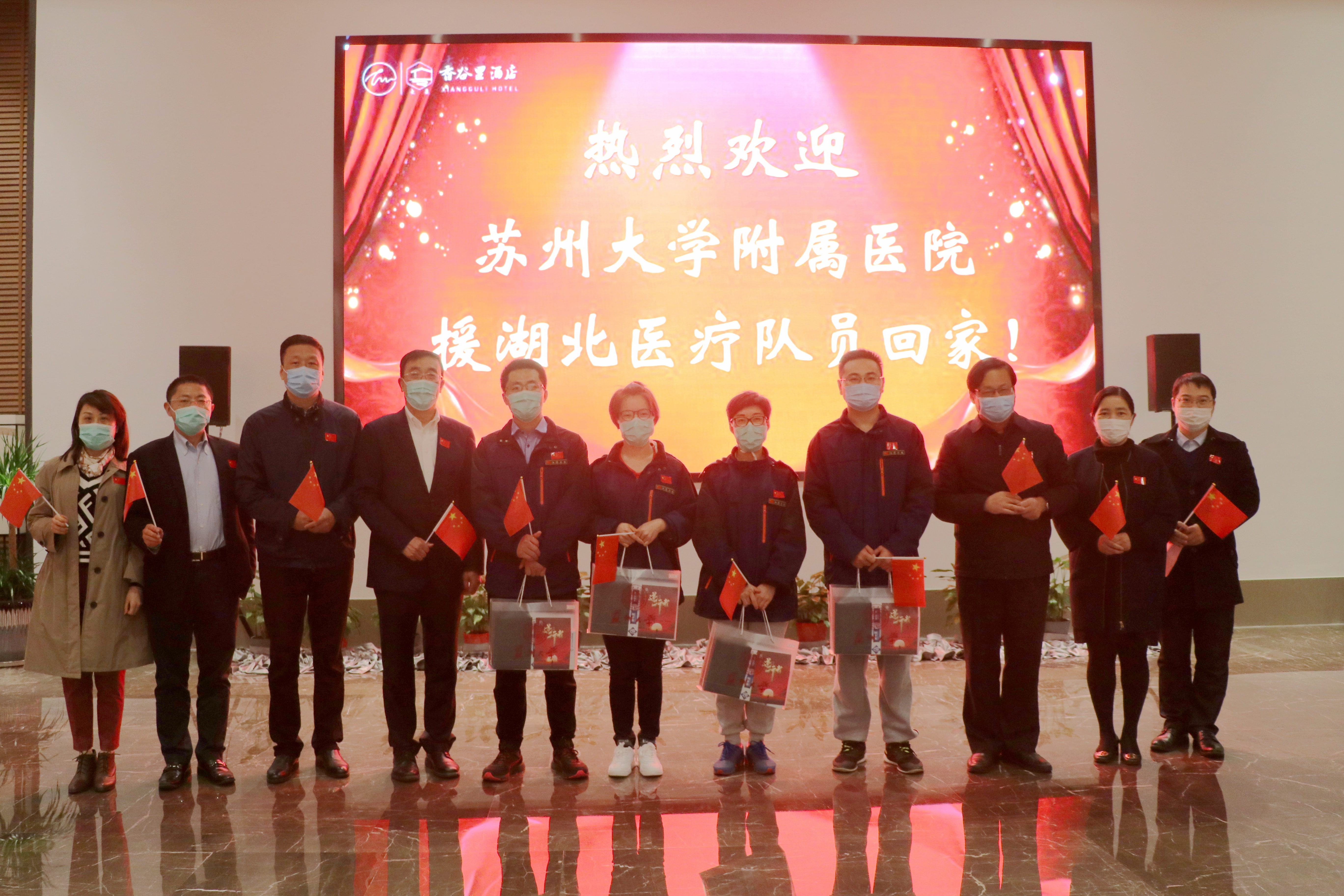 在苏州大学附属医院派出的八批共计204名驰援湖北的医疗队员中,第三批支援武汉同济医院光谷院区的89人“大部队”人数最多。他们按照国家统一安排于3月31日从湖北撤离返回苏州,经过14天的休养,将陆续回家与亲友团聚。4月14日晚,我校举行附属医院援湖北医疗队员回家欢迎仪式,苏大附一院和苏大附二院共32名医疗队员参加。