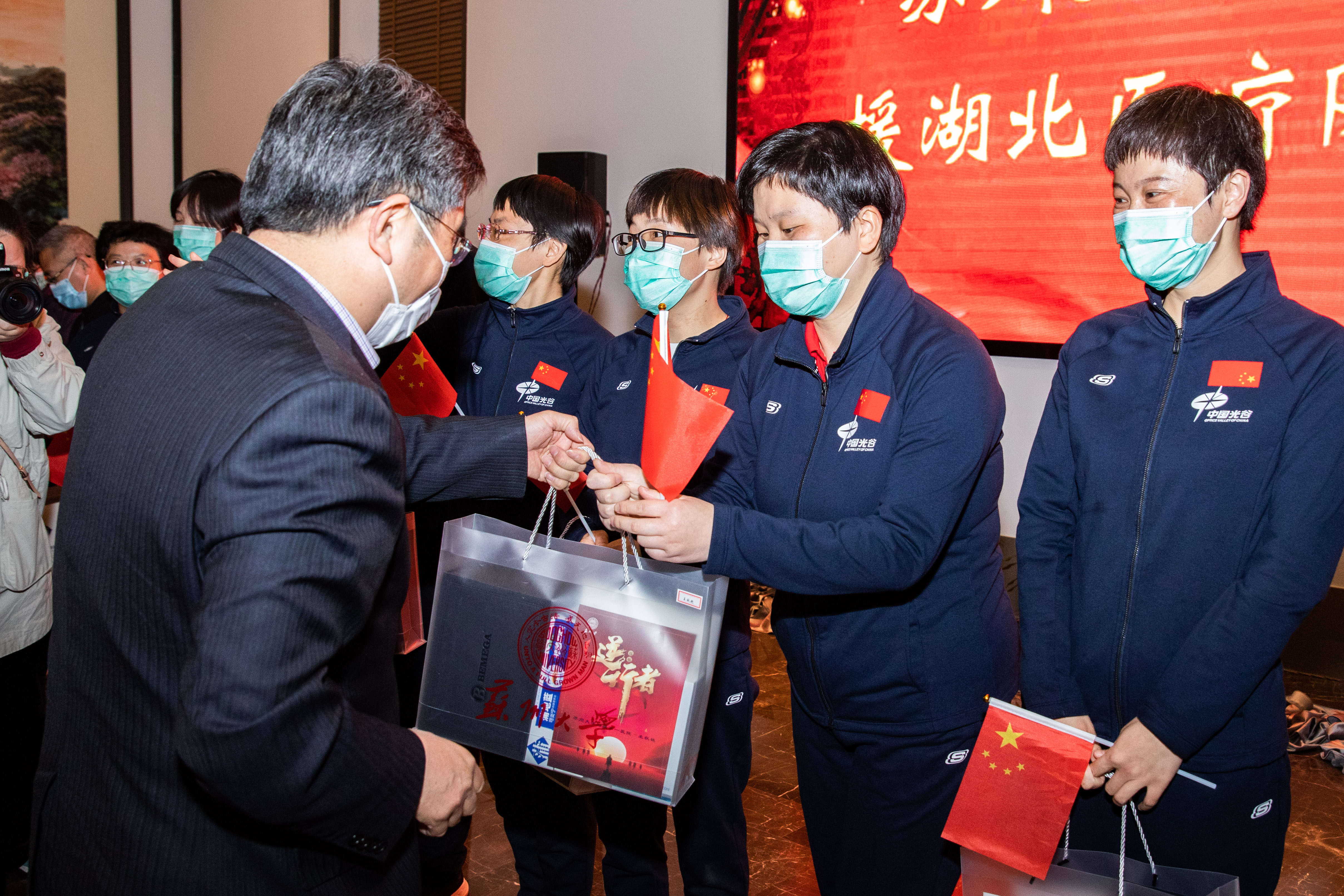 最后,江涌书记向援湖北医疗队队员赠慰问品,全体与会人员合影留念。