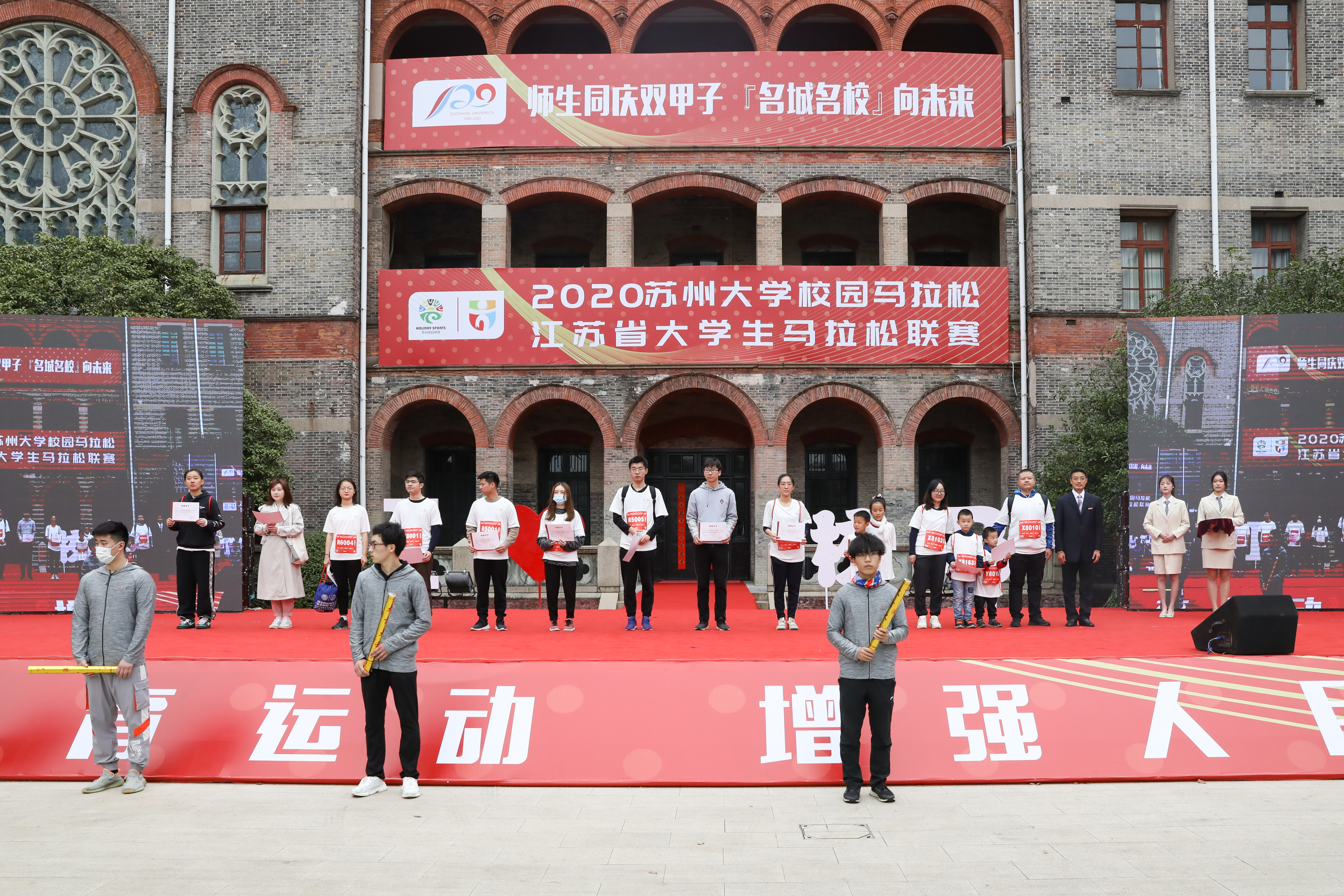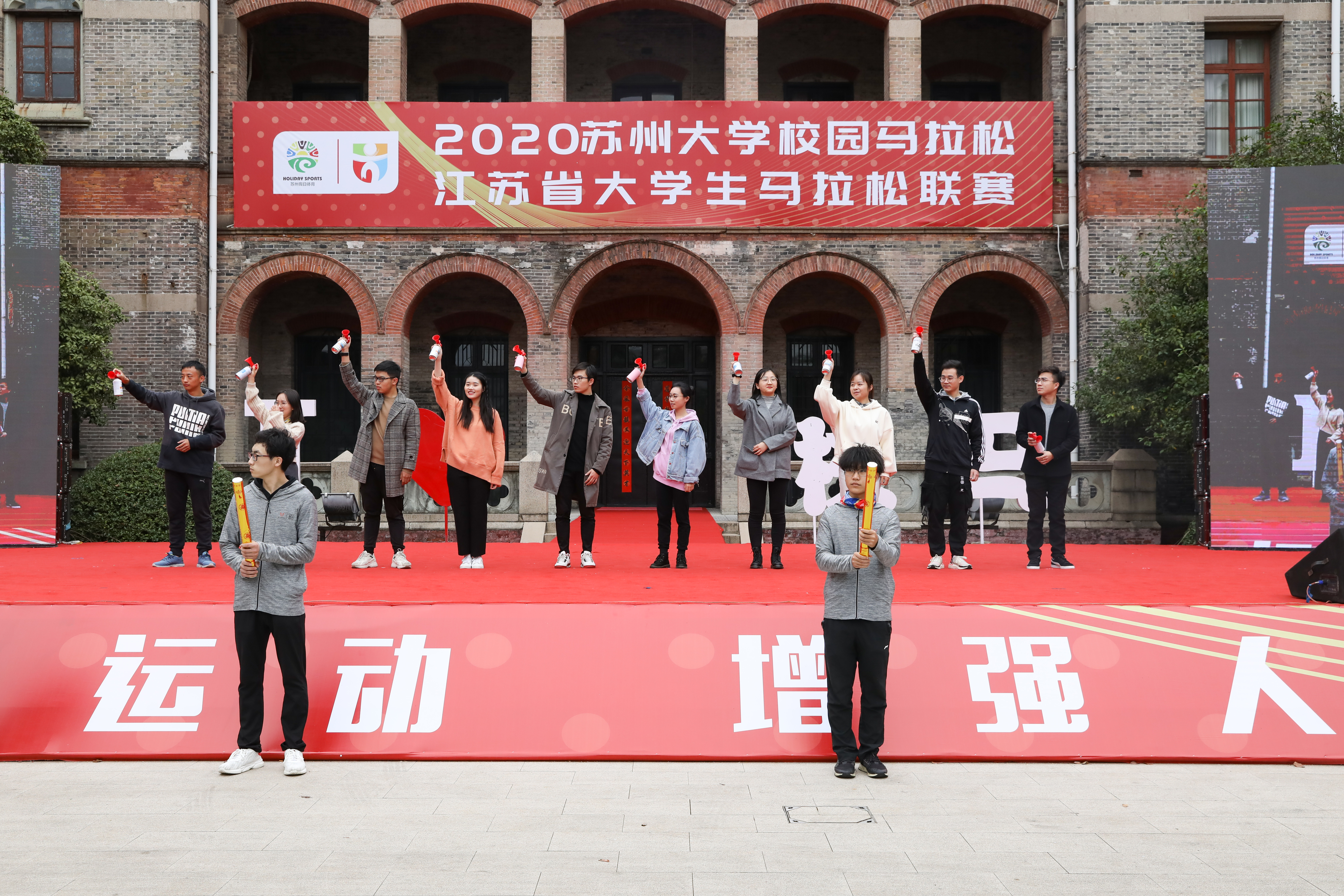 “师生同庆双甲子,名城名校向未来!”在激动澎湃的音乐声中,出席活动的领导和嘉宾入场,并为2020苏州大学校园马拉松赛暨江苏省大学生马拉松联赛的十公里赛和半程赛发枪。