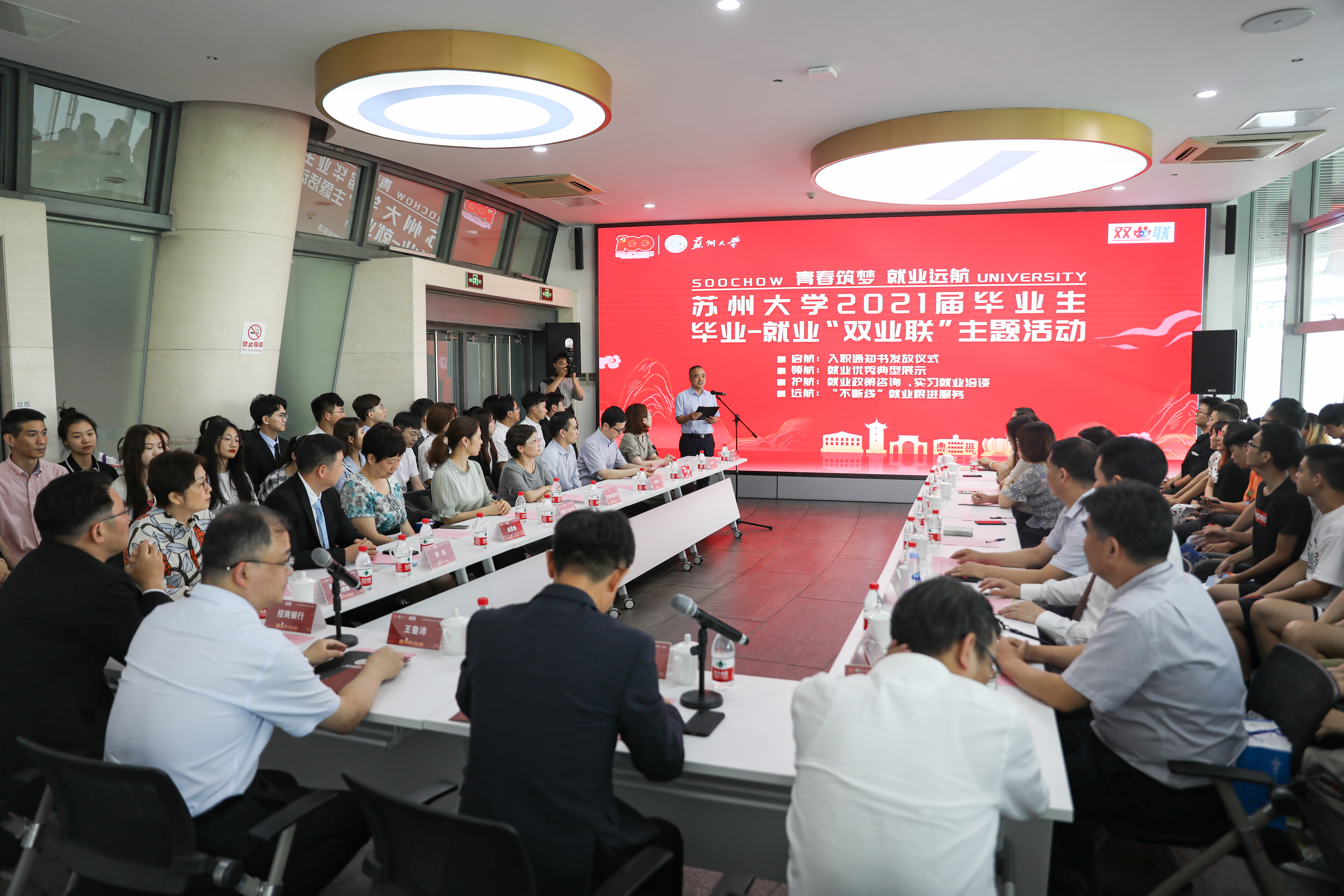 “双业联”主题活动围绕“青春筑梦就业远航”分为启航——入职通知书发放仪式,领航——就业优秀典型展示,护航——就业政策咨询、实习就业洽谈,远航——“不断线”就业跟进服务等四个板块。