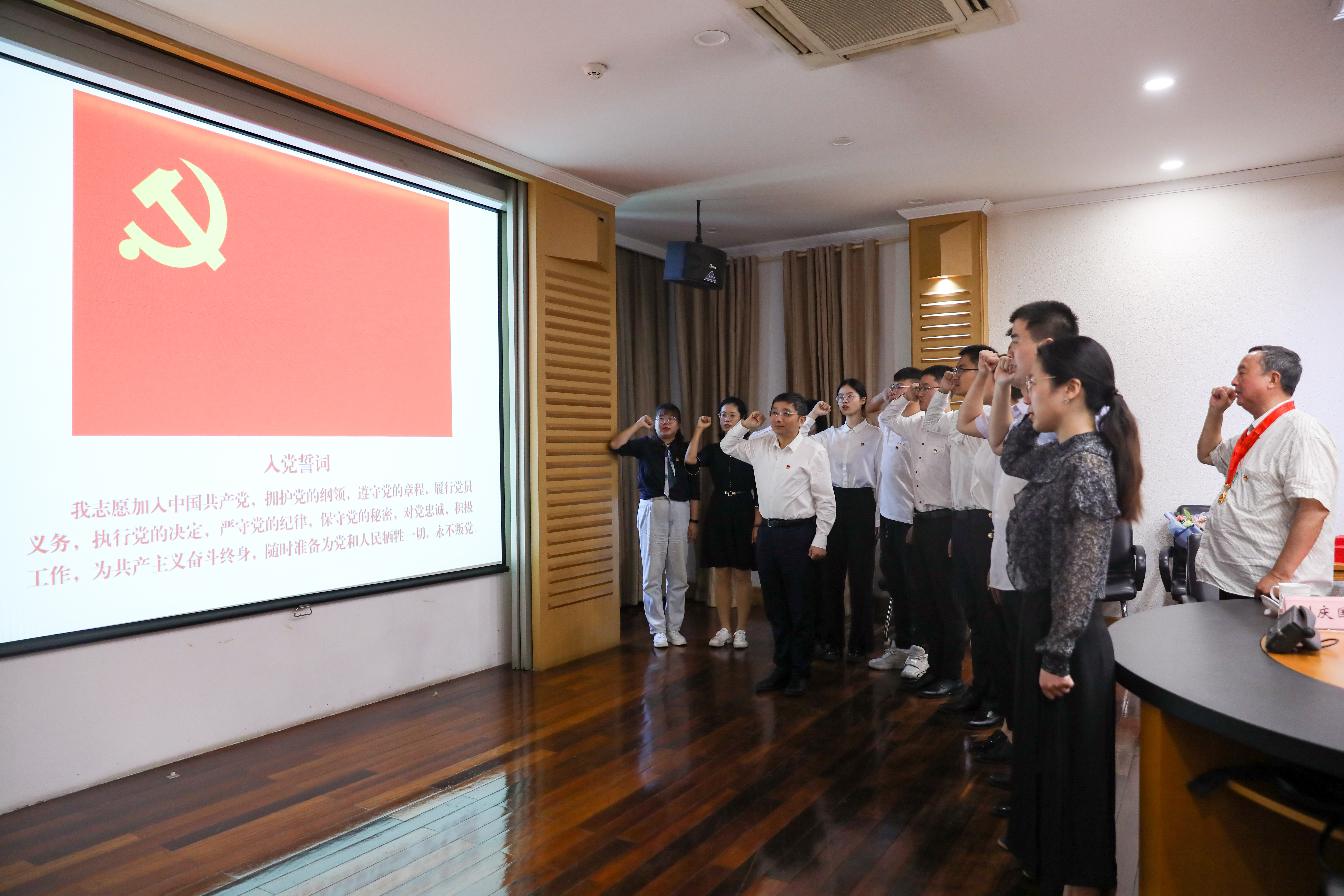 随后,在江涌书记的领誓下,1 1名胸前佩戴着“光荣在党50年”纪念章的老党员与新发展的党员一起,高举右拳,面向党旗,新党员宣誓,老党员重温入党誓词。参会党员纷纷表示,将以老党员为榜样,在党爱党,在党为党,对党忠诚,努力提高自身的思想水平与专业水平,为学校高质量发展,为实现中华民族伟大复兴的中国梦贡献青春力量!