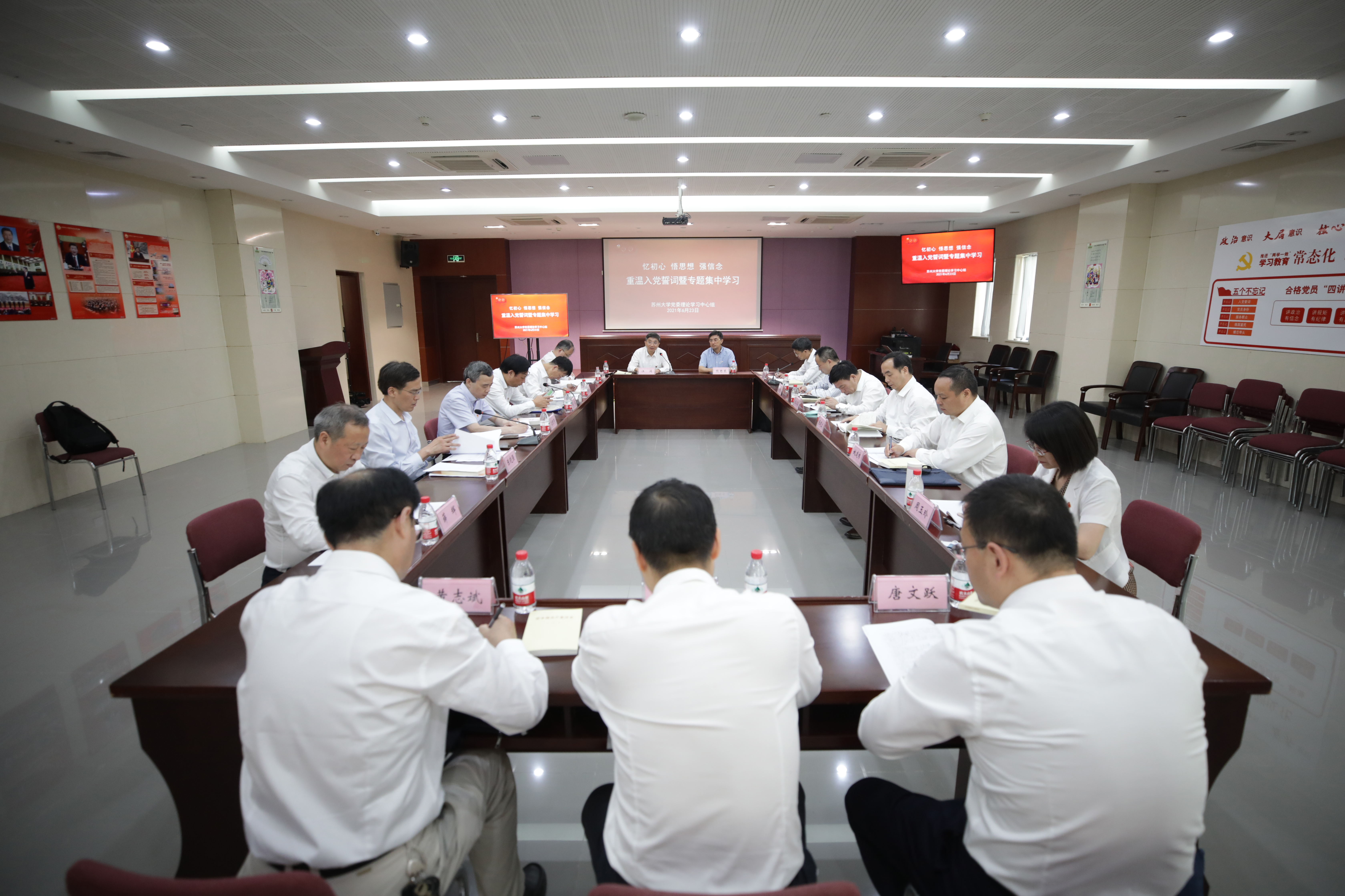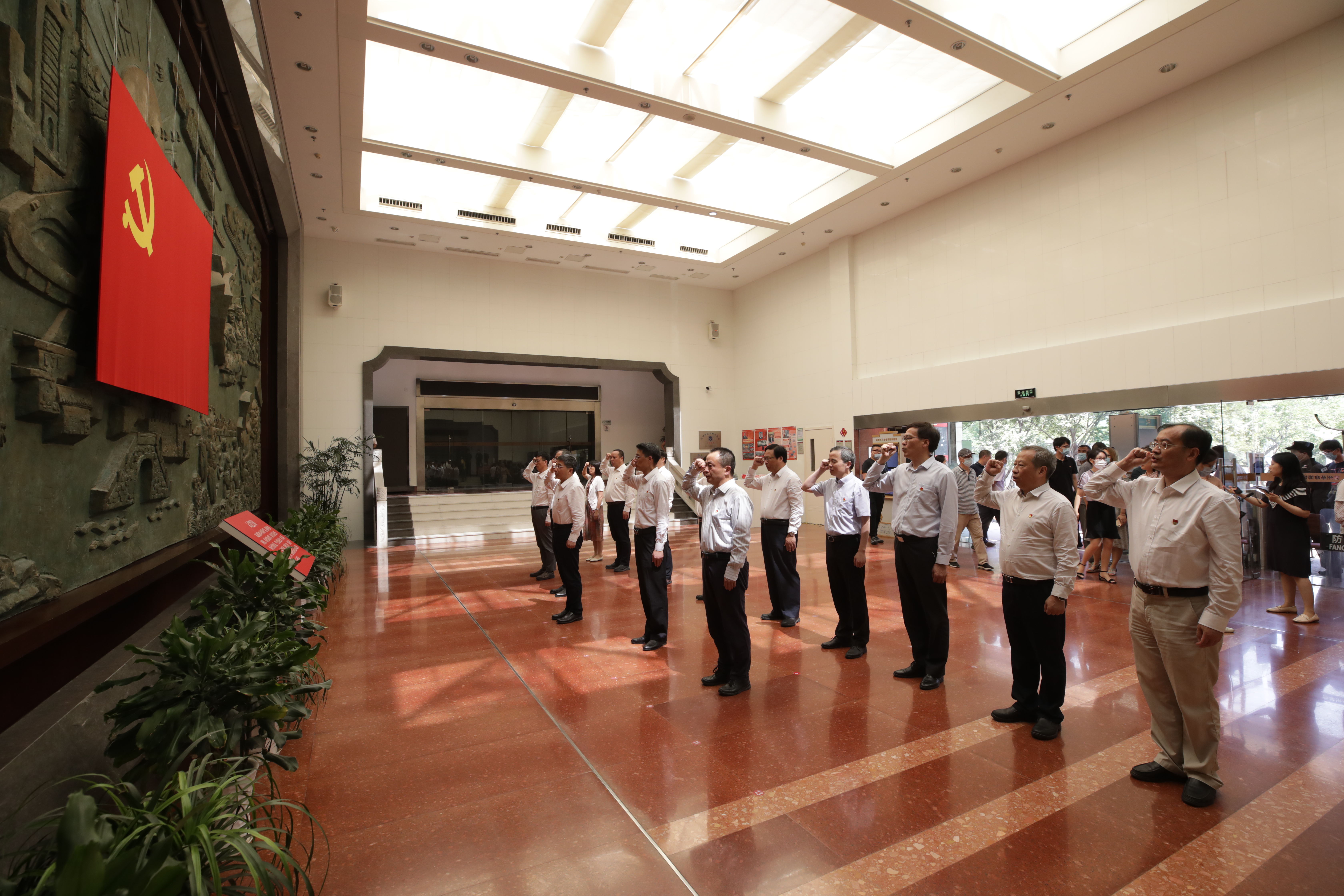 6月23日下午,校党委理论学习中心组全体成员来到苏州革命博物馆开展专题学习。学习开始前,校党委班子及中心组部分成员在庄严的党旗下重温入党誓词,宣誓仪式由校党委书记江涌领誓。