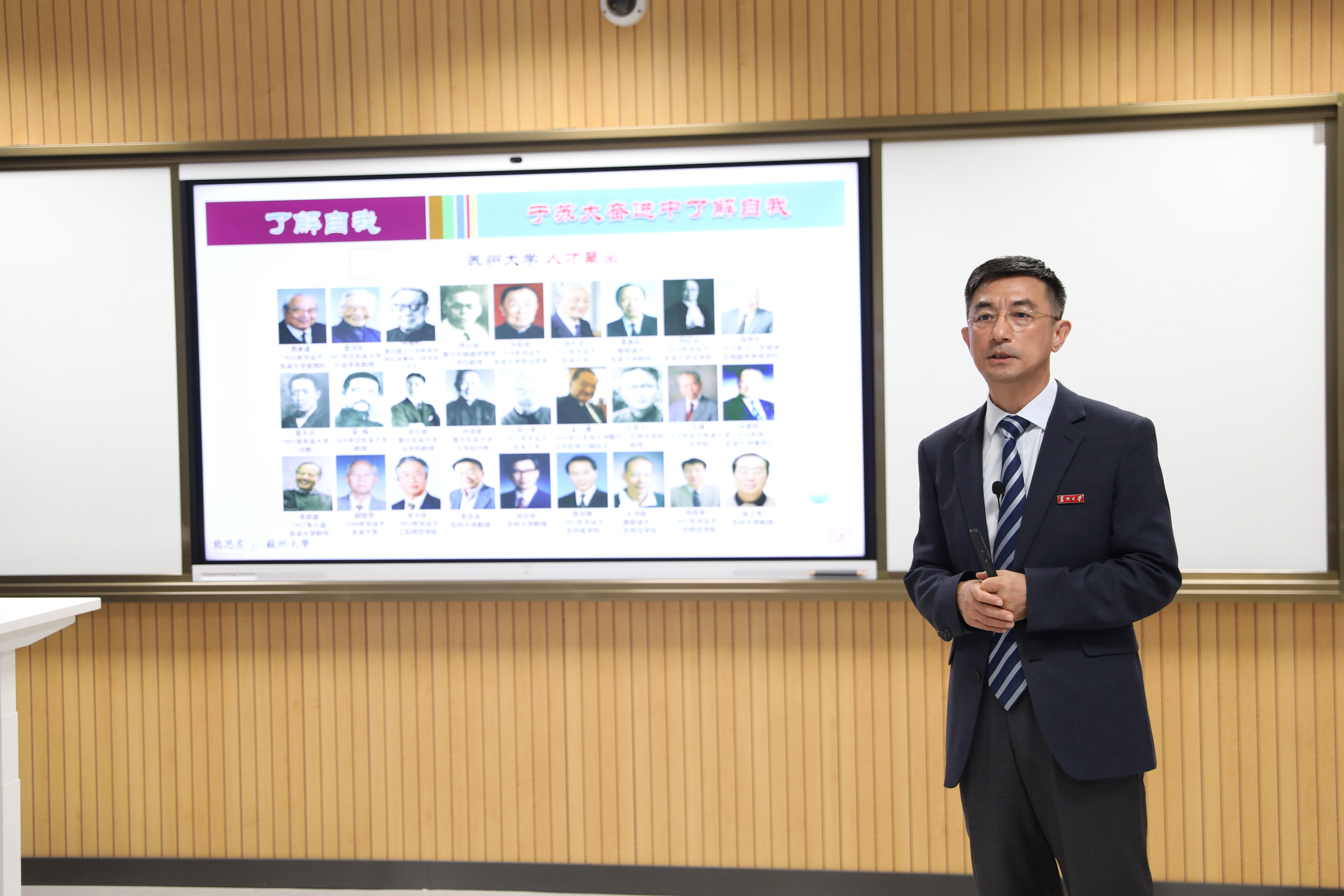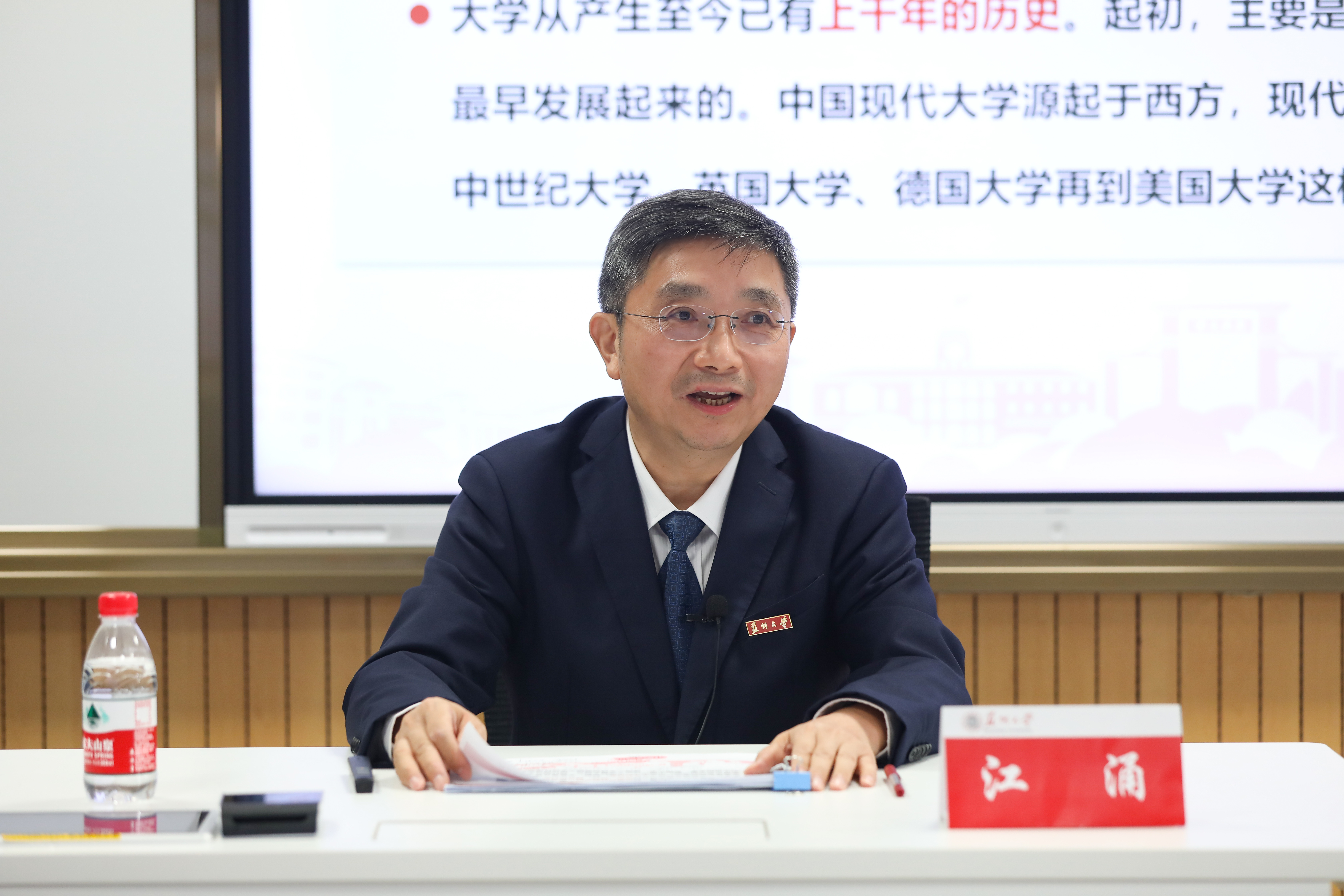 为了帮助同学们进一步了解苏州大学,江涌书记向大家介绍了天赐庄校区内极具古典建筑风格的标志性建筑,并从历史沿革、学科门类、师资队伍、杰出校友、人才培养、科学研究等方面介绍了学校办学理念及发展情况。他指出,苏州大学是一所有历史、有内涵、有贡献的大学,回顾学校121年来的办学历史,是筚路蓝缕、艰苦创业的发展史,是海纳百川、团结奋斗的发展史,是自强不息、负重奋进的发展史。