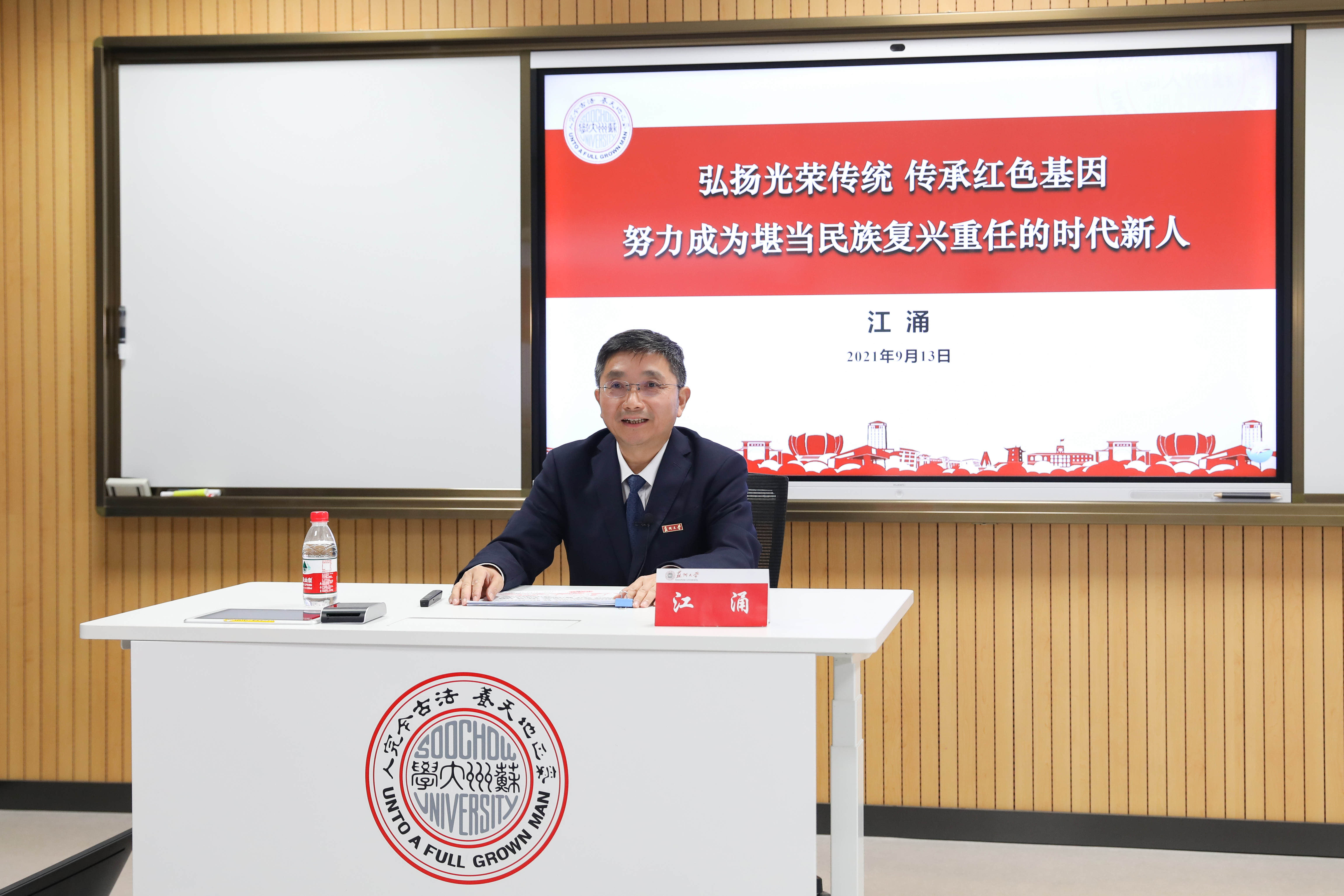 13日下午,校党委书记江涌以“弘扬光荣传统 传承红色基因 努力成为堪当民族复兴重任的时代新人”为题,以大学是什么、苏州大学是一所怎样的大学、怎么读大学为切入点,为新生带来了一堂生动的“大学第一课”。