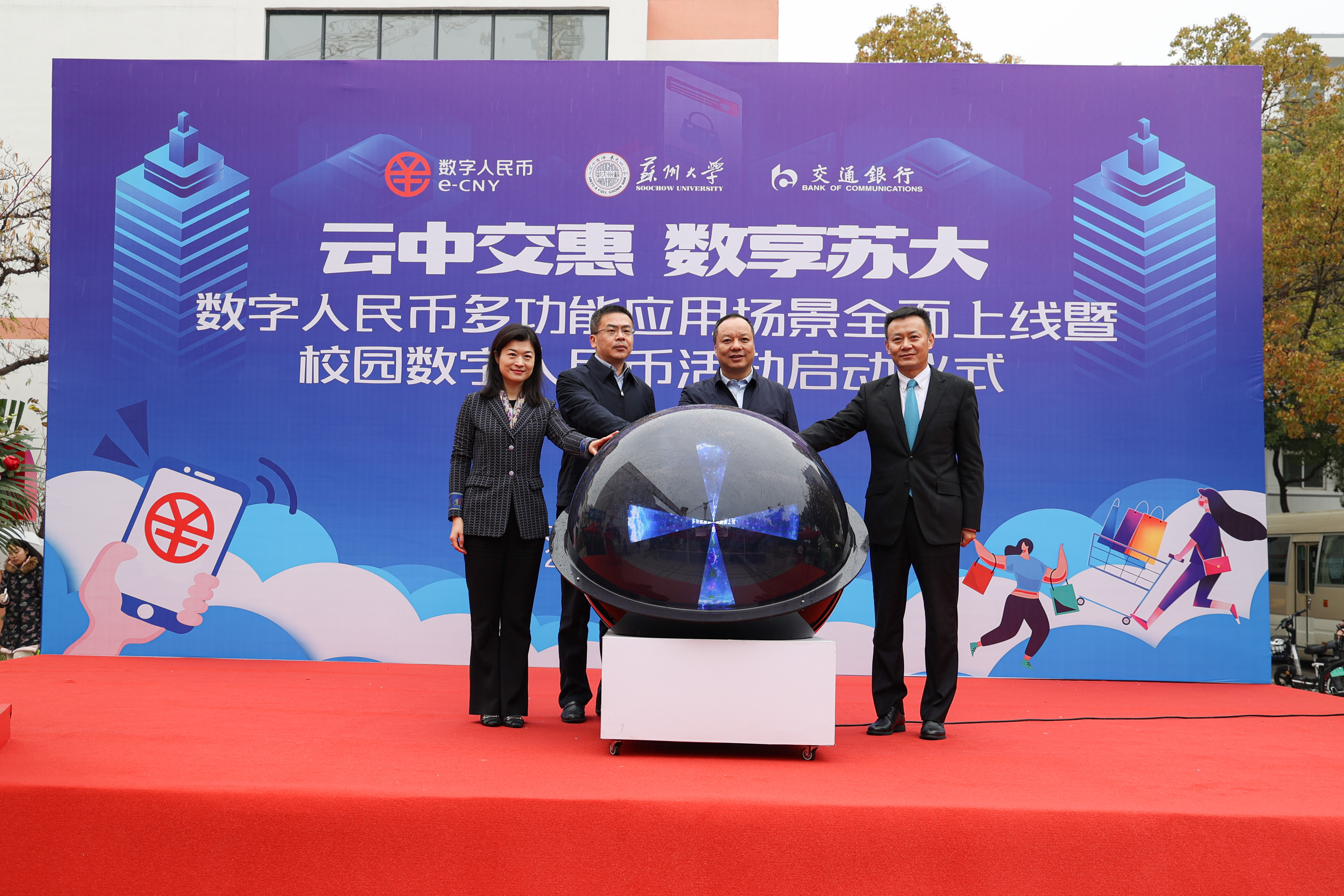 为积极响应国家数字人民币发展战略,展示苏州大学与交通银行在数字人民币校园应用场景的探索成果,推动数字人民币走进大学、走近师生,12月12日上午,“云中交惠 数享苏大”数字人民币多功能应用场景全面上线暨校园数字人民币活动启动仪式在我校天赐庄校区举办。中国人民银行苏州市中心支行副行长陈军,货金处副处长刘振,交通银行苏州分行党委书记、行长王晓松,党委委员、副行长彭悦箐,我校副校长姚建林,以及交通银行苏州分行相关负责人,我校相关职能部门负责人和师生代表共同参与活动。