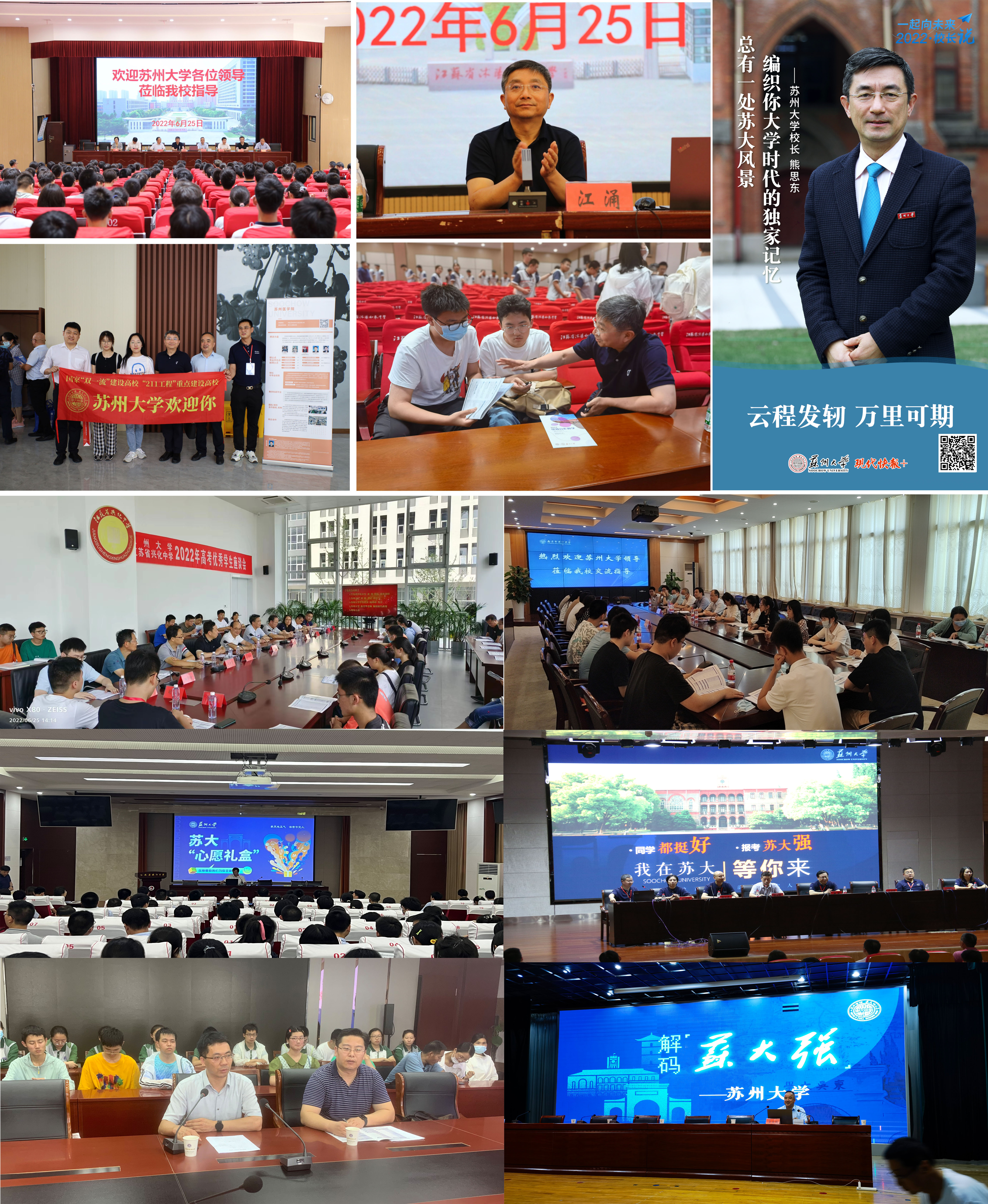 学校党政领导高度重视招生宣传工作。6月25日,校党委书记江涌一行赴江苏省沭阳高级中学、沭阳如东中学、宿迁中学开展招生宣讲,亲自担任宣讲员为优秀学子详细介绍苏大优势,深入解读招生政策,为考生和家长答疑解惑。他寄语广大优秀学子:“立足新时代新征程,努力成长为堪当民族复兴重任的时代新人,选择苏州大学,在青春的赛道上跑出最美风采!”熊思东校长录制视频为广大考生送上祝福:“云程发轫,万里可期。祝各位同学蟾宫折桂,金榜题名。”他向考生们发出诚挚邀请,“学在苏大,感受常新。扎根中国大地,这里走出了无数为经济社会发展添砖加瓦的栋梁之材,期待这里能成为你们梦想启航的新起点。”
