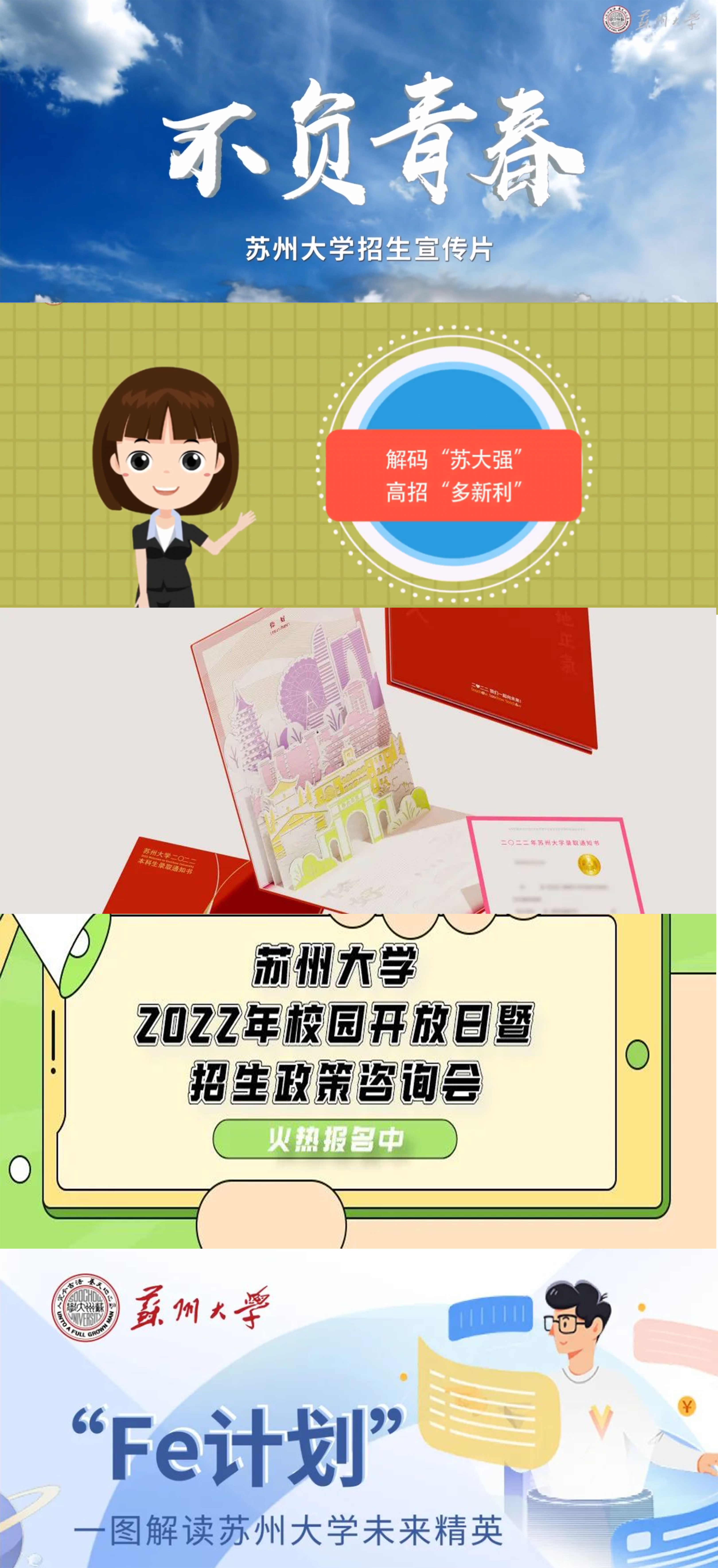 2022年本科招生宣传片《不负青春》倾情上线,胸怀赤子之心,踏上追梦之旅,共同来倾听苏大青年的成长故事。从图书馆到实验室,求索前人与尝试未来交相辉映;从教学楼到实习点,理论深耕与实践探索相辅相成。苏大青年们在这里雕刻青春、撰写未来。不负时代重托,不负青春韶华,苏大人正以昂扬的姿态,开放的胸襟和全球的视野,共同书写新的青春华章。同期《苏大,实不相瞒,我看上你了》《解码“苏大强”,高招“多新利”》动画片发布,“我有扛打的颜值”“我有绝对的实力”诙谐风趣,娓娓道来。苏州大学2022年本科录取通知书《交织东吴梦,共绘新篇章》以城市记忆、校园纽带、未来想象为主题,通过“苏大&我,苏大@我”拉近与“你”的距离,用“∞”突出主题,寓意着“小22”们与苏大共同成长,一起织就未来的“∞”(无限)可能性!通知书一经推出便冲上微博热搜,掀起招宣热浪。