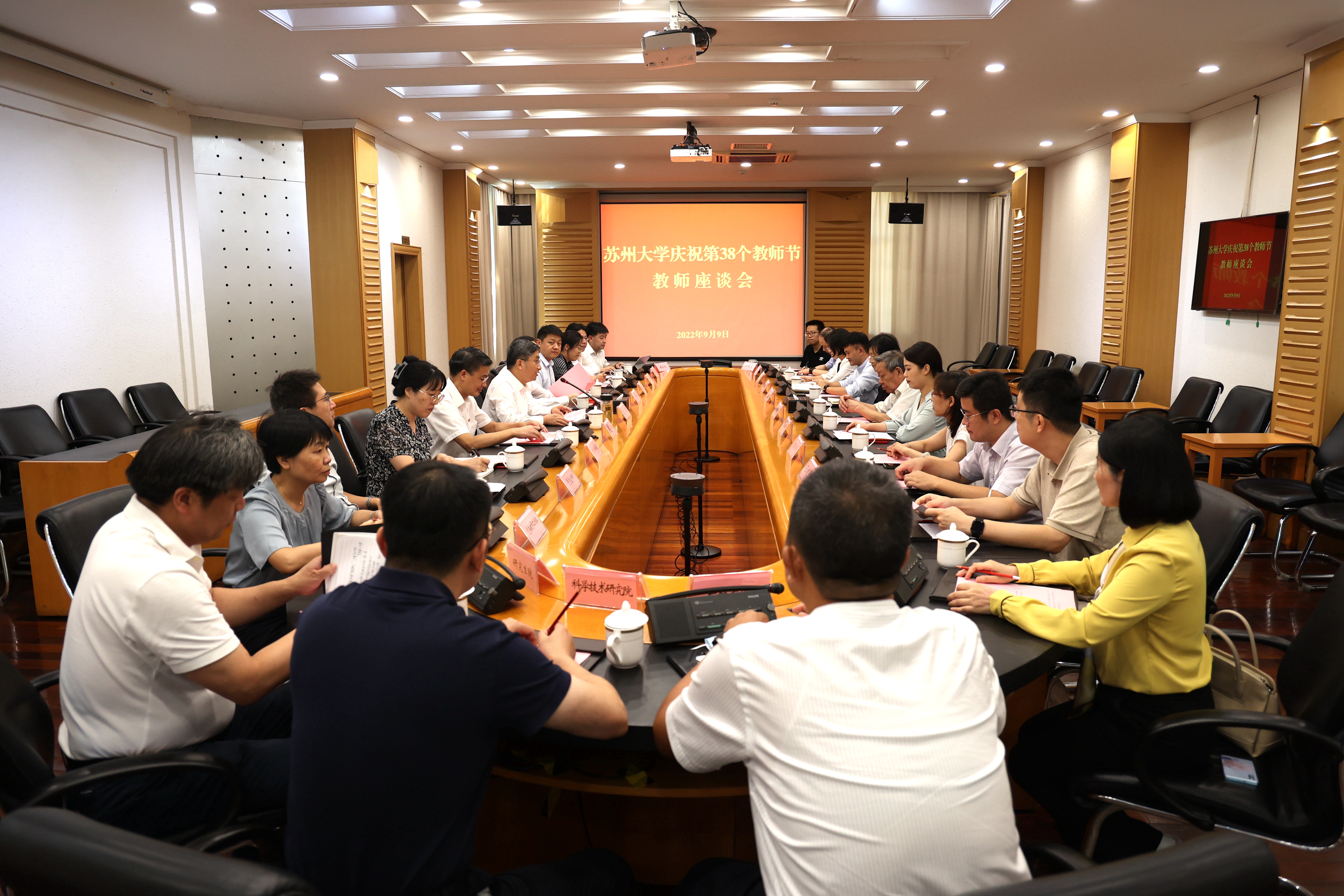 在第38个教师节来临之际,苏州大学举行系列活动庆祝教师节。9月9日下午,庆祝教师节座谈会在红楼会议中心召开。校党委书记江涌、校长张晓宏、党委副书记邓敏,相关职能部门主要负责人,来自各学院(部)的11位优秀教师代表出席座谈会,会议由江涌主持。