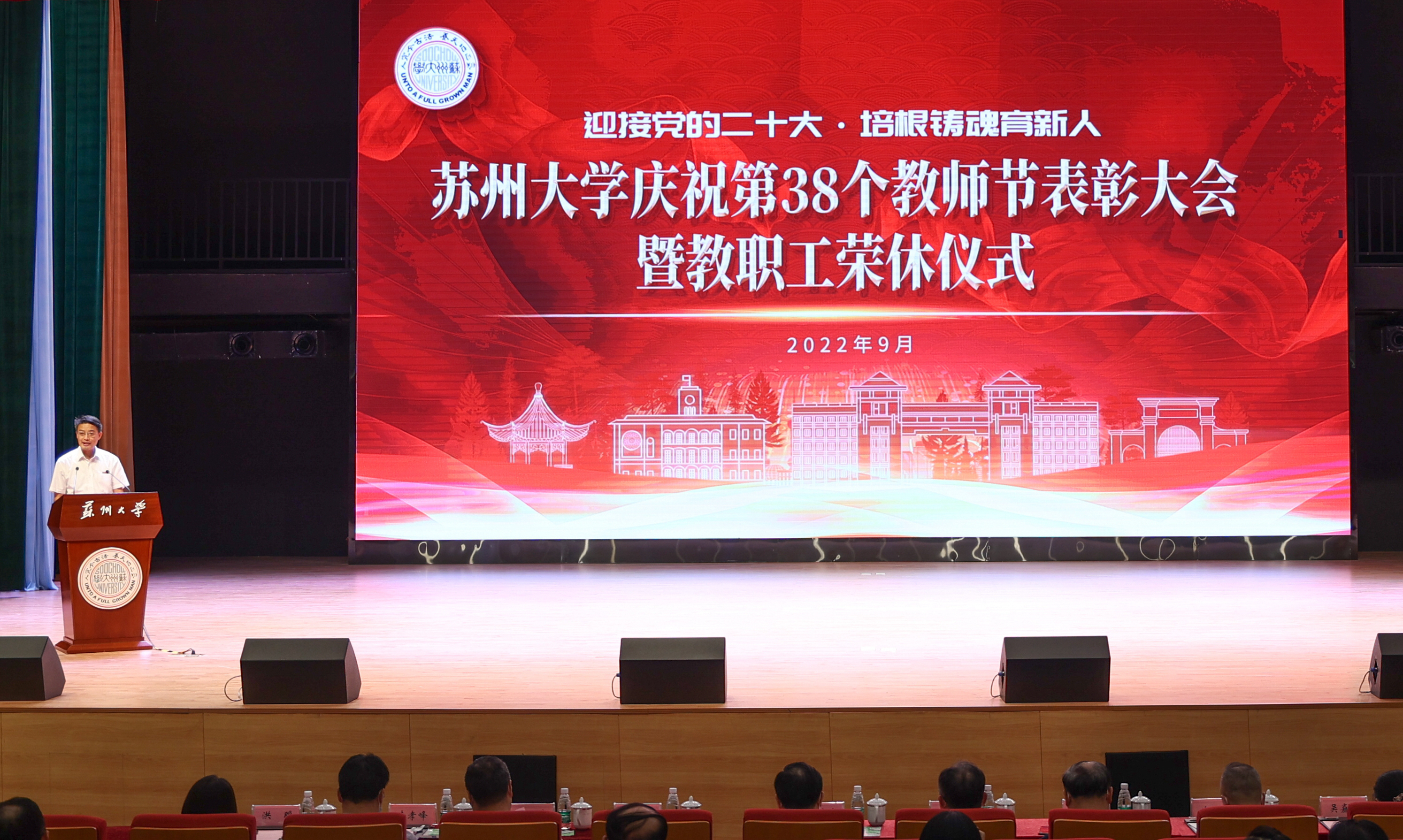 江涌向全校教师致以诚挚的节日问候。他指出,在喜迎党的二十大胜利召开和学校第十三次党代会之际,学校开展系列活动庆祝第38个教师节,激励全校教师坚定理想信念,砥砺育人使命。一直以来,学校大力实施人才强校战略,教师队伍在人才培养、科学研究、社会服务等学校各项改革发展事业中发挥了至关重要的作用,是学校发展的中流砥柱。他希望全校教师认真学习习近平总书记系列重要讲话、重要回信和重要指示精神,践行培根铸魂职责使命,真正做到心系国家事、肩扛国家责,按照“四有”好老师标准严格要求自己,争当学生为学、为人、为事的“大先生”,在苏州大学“双一流”建设中发挥重要作用,努力成为学生心中偶像、社会楷模、世人榜样。