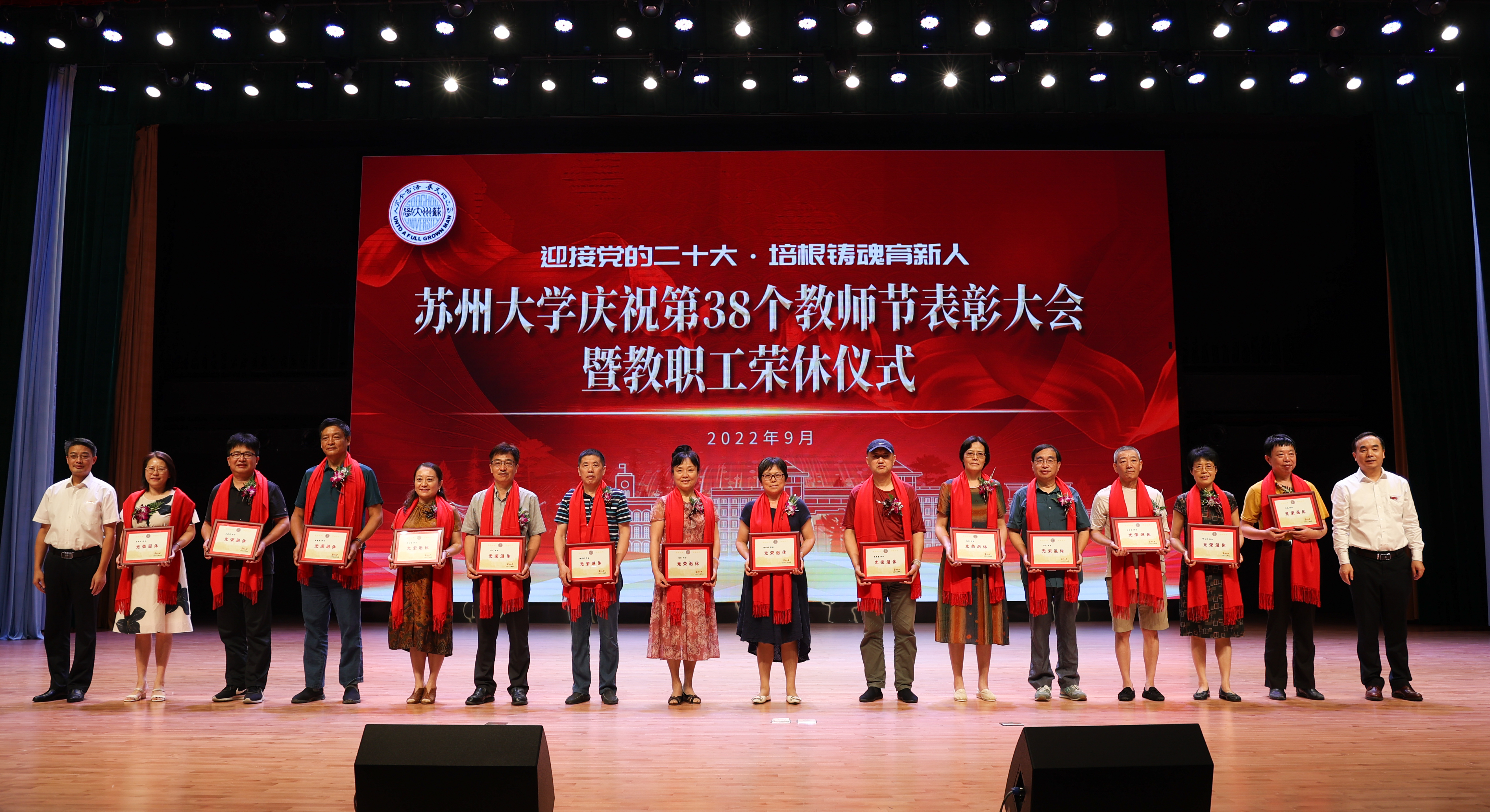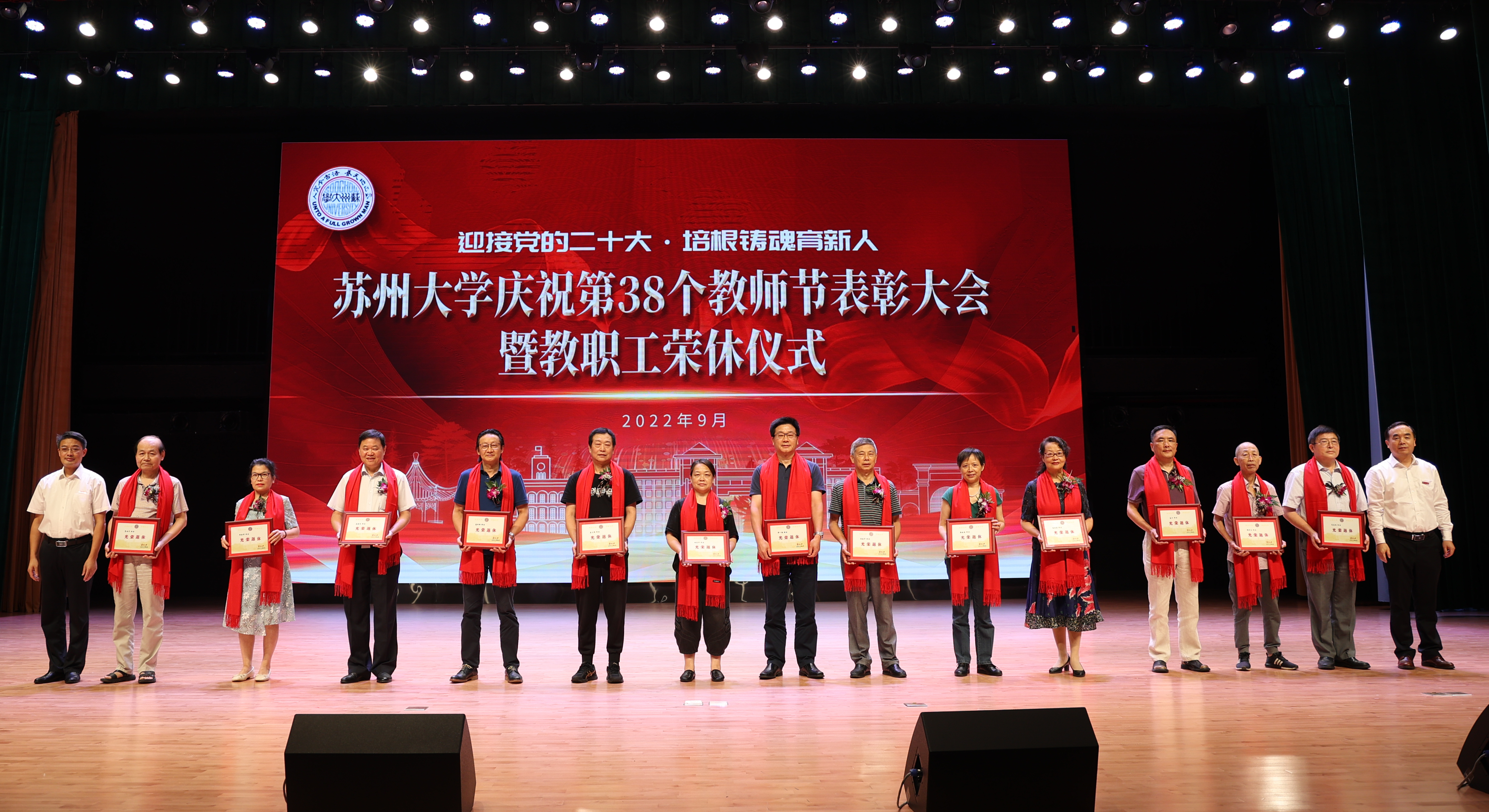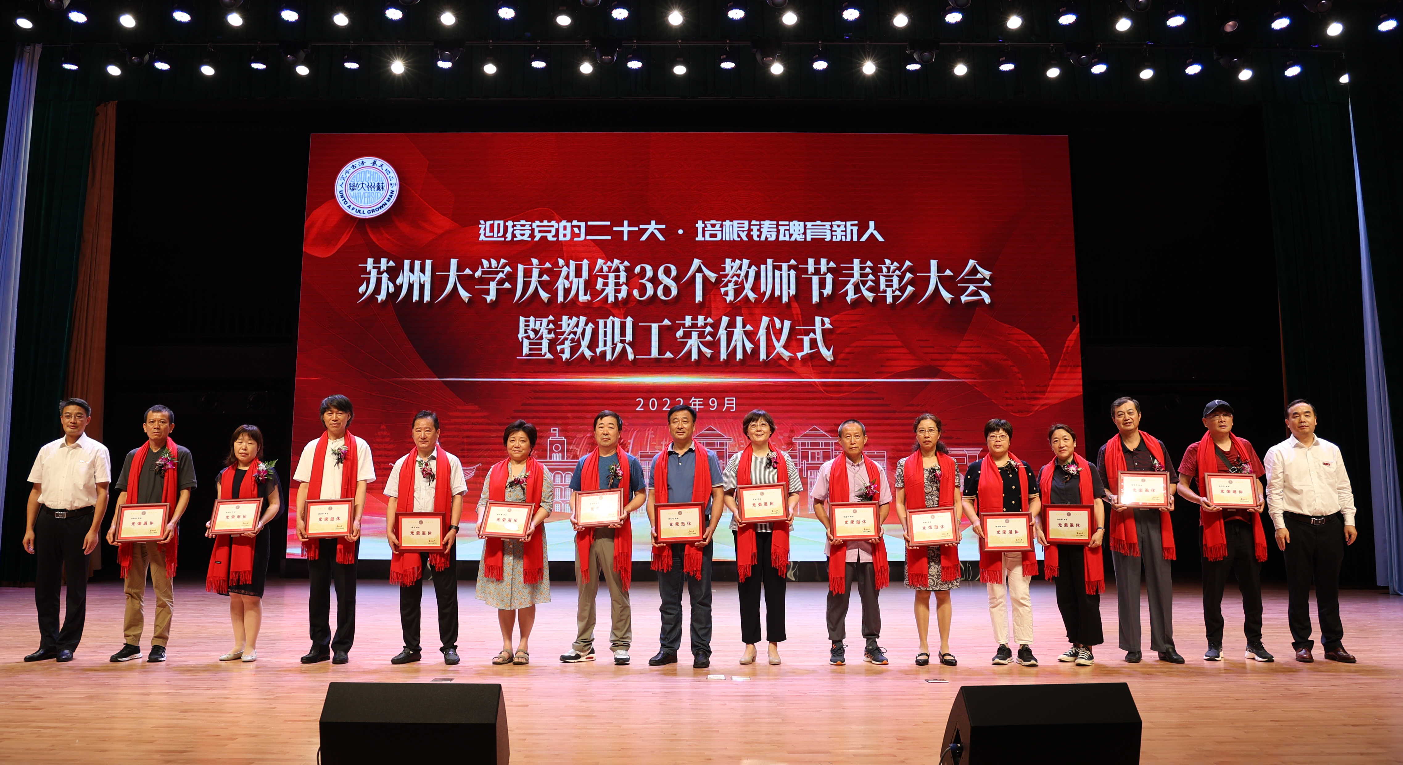 邓敏宣读了2022年度苏州大学高尚师德奖教金获奖名单、2022年度苏州大学“兴育新”宣传思想政治工作奖获奖名单、从事教育工作满30年教职工名单和荣休教职工名单。校党委常委、副校长姚建林宣读了近一年来学校、教师在省部级以上的主要获奖名单。张晓宏、邓敏逐一为获奖教师颁发证书并合影留念。